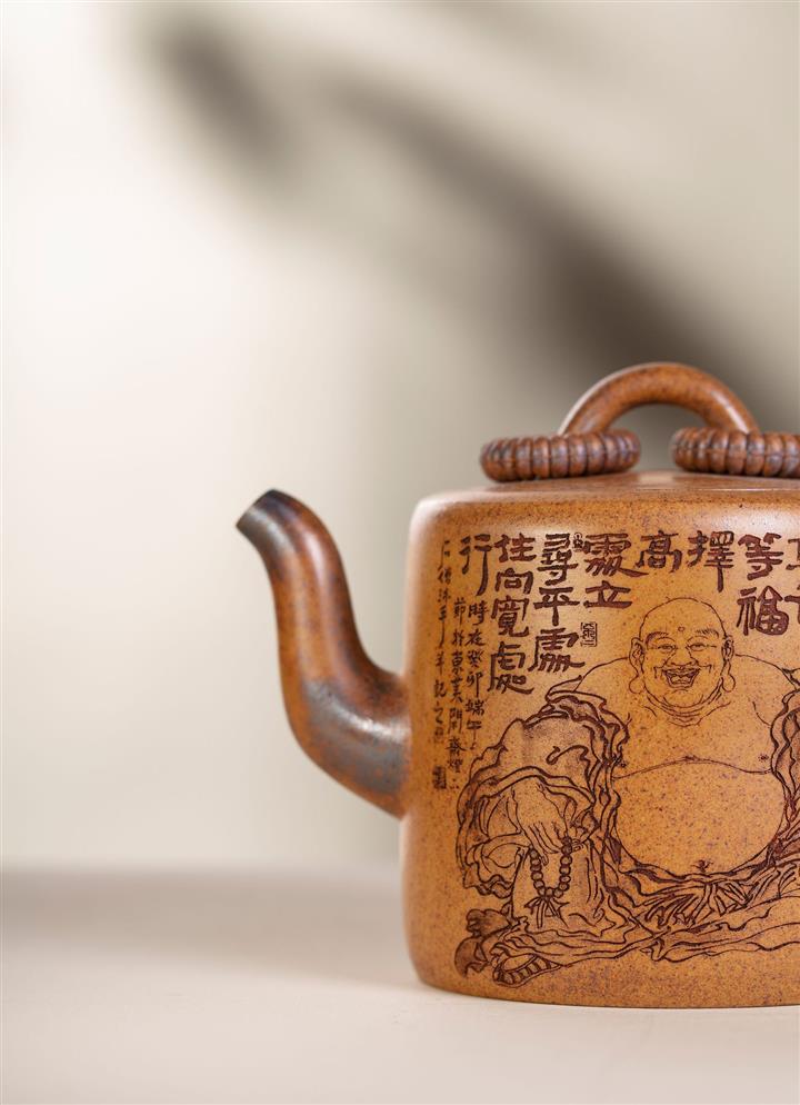 【泥料特點】砂土氣重,似淳實農民,日久使用,漸露鋒芒,養成變化,溫潤莊重。紫砂是壹種雙重氣孔結構的多孔性材質,氣孔微細,密度高。用紫砂壺沏茶,不失原味,且香不渙散,得茶之真香真味。紫砂使用越久,壺身色澤越發光亮照人,氣韻溫雅。紫砂壺長久使用器身會因撫摸擦拭,變得越發溫潤光澤。