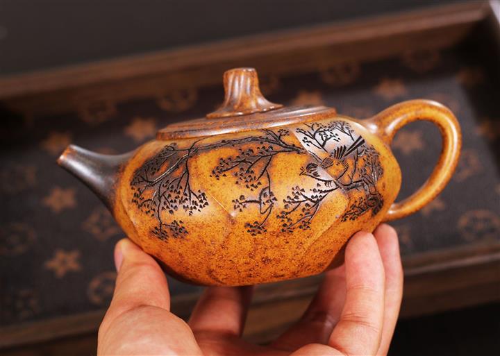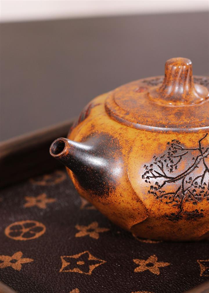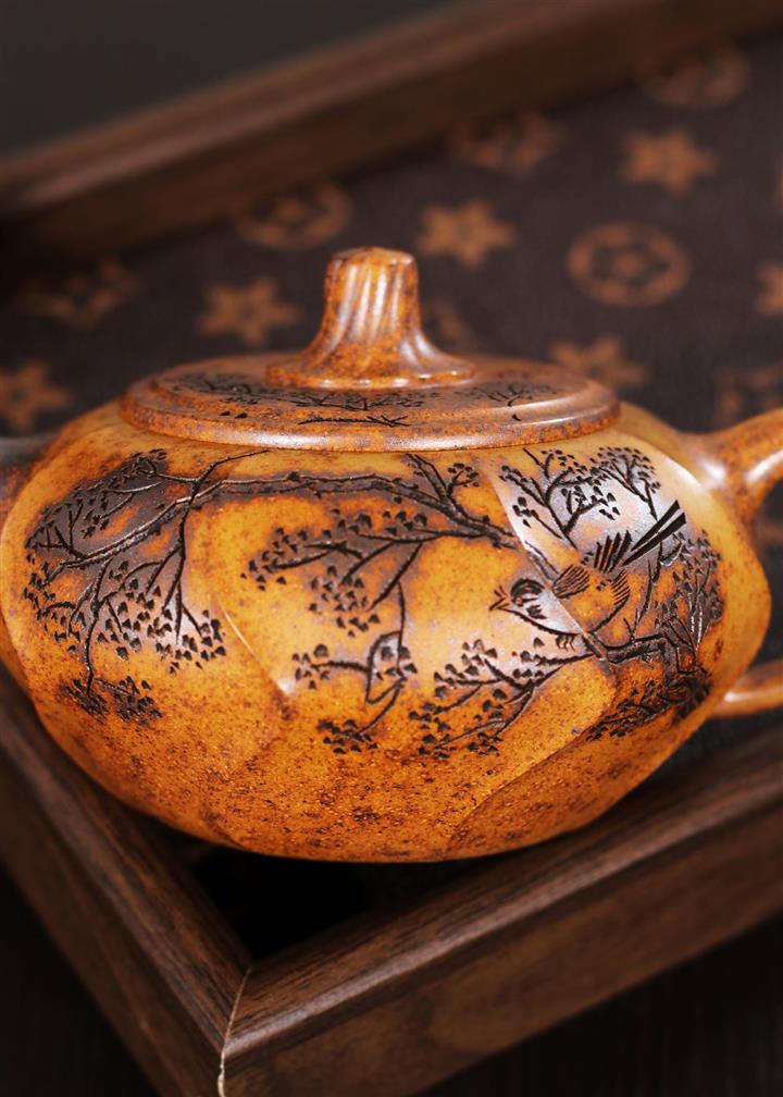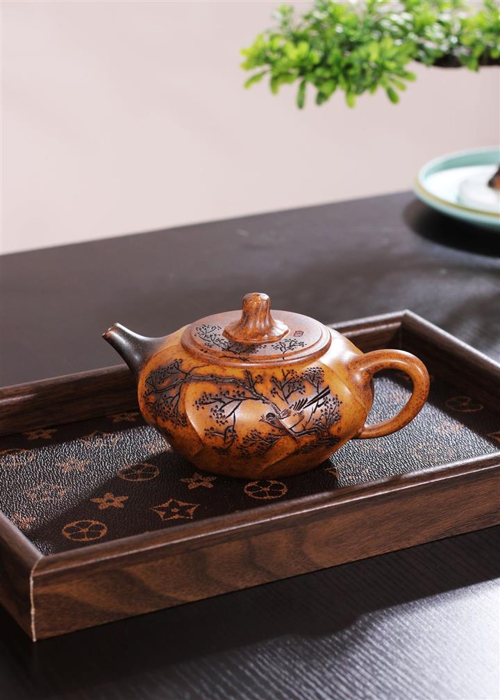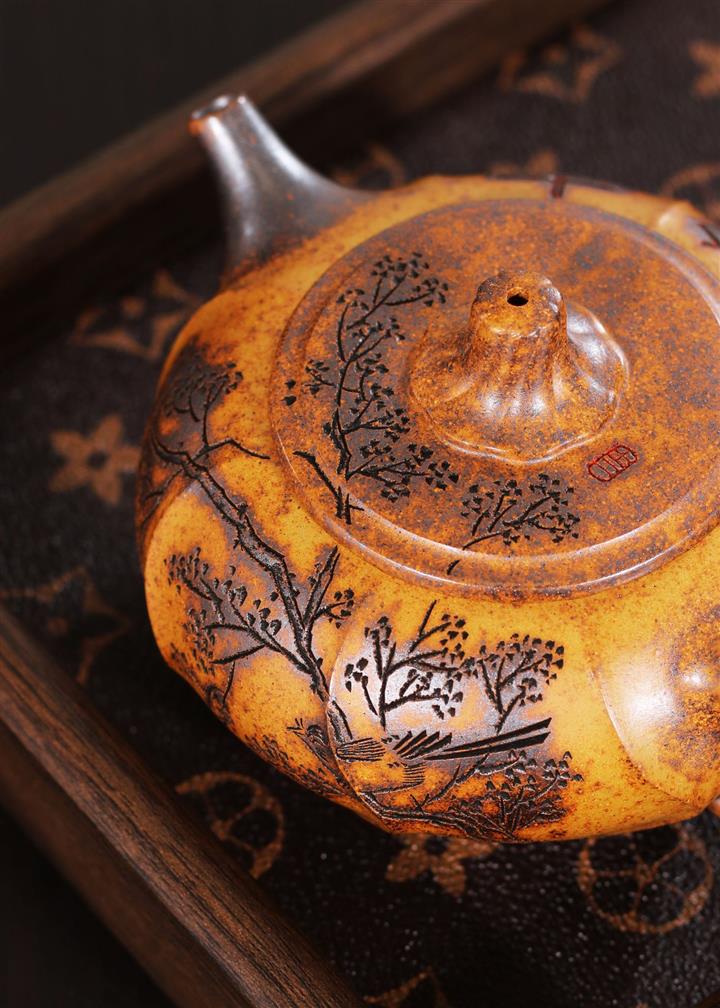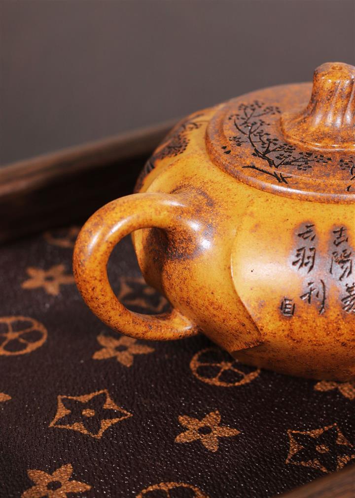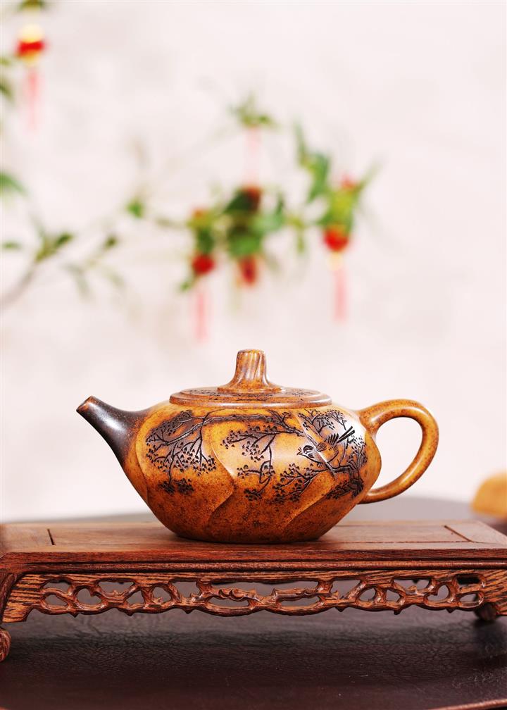 原礦紫泥刻繪傲梅容天茶壺POT7055