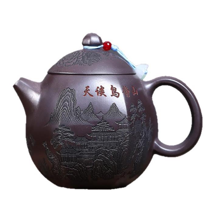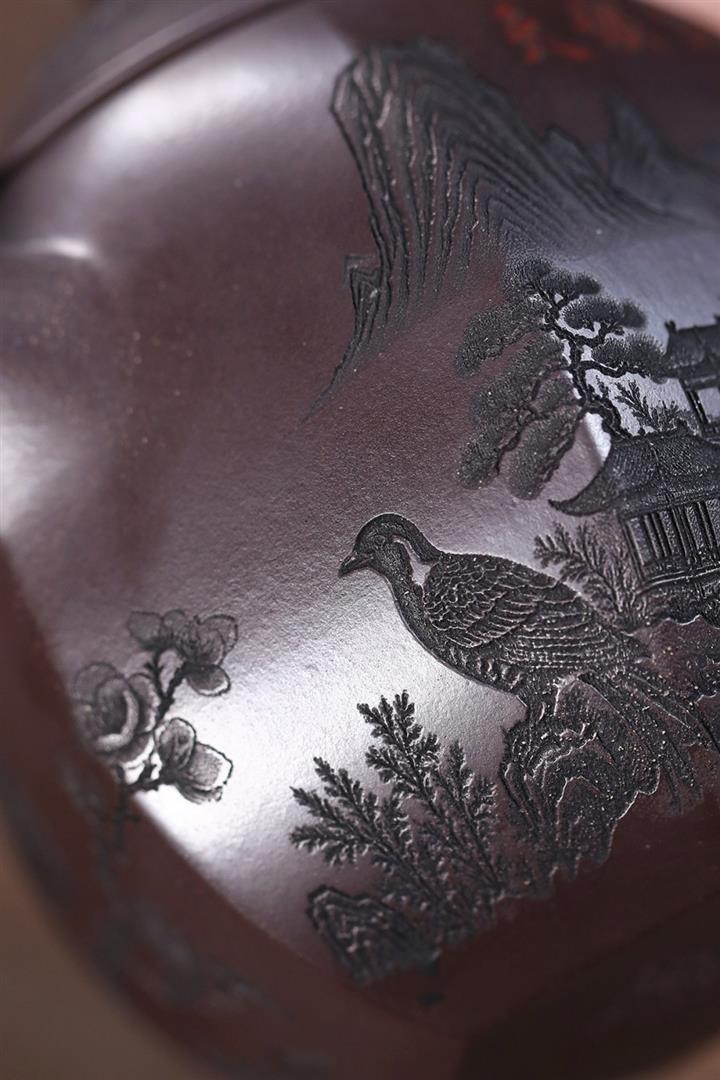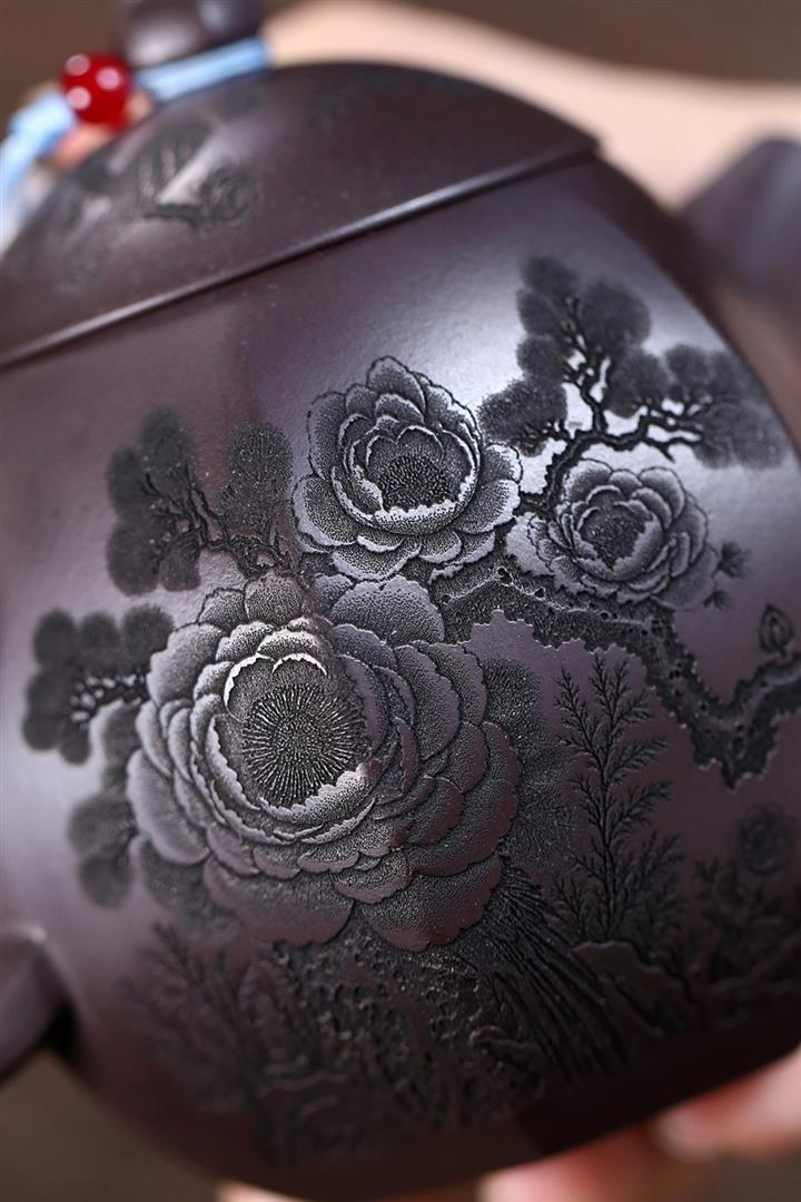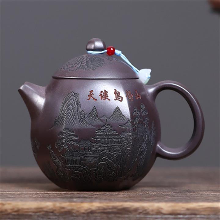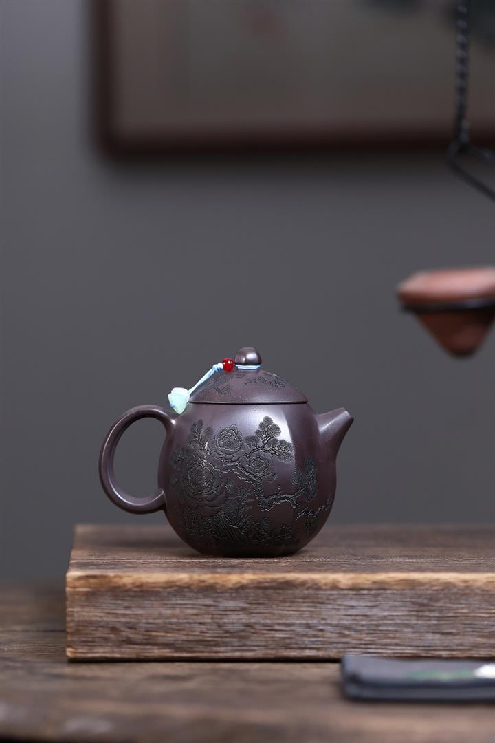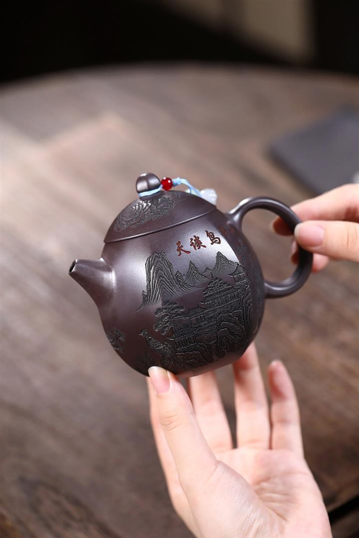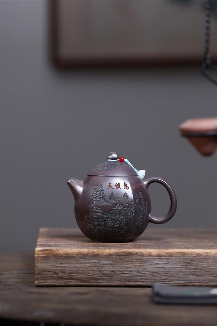 原礦天青泥紫砂壺全手工刻畫松風扁韻茶壺POT4057