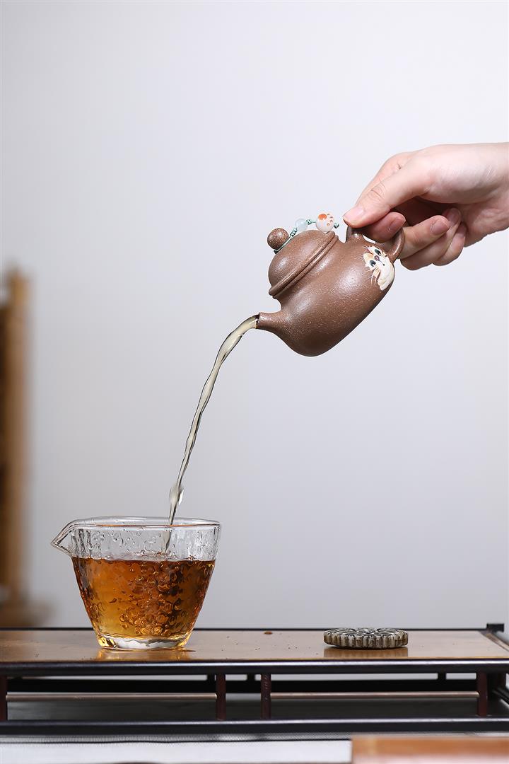 【泥料特點】砂土氣重,似淳實農民,日久使用,漸露鋒芒,養成變化,溫潤莊重。紫砂是壹種雙重氣孔結構的多孔性材質,氣孔微細,密度高。用紫砂壺沏茶,不失原味,且香不渙散,得茶之真香真味。紫砂使用越久,壺身色澤越發光亮照人,氣韻溫雅。紫砂壺長久使用器身會因撫摸擦拭,變得越發溫潤光澤。