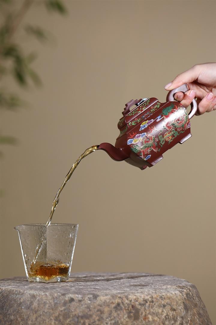【泥料特點】砂土氣重,似淳實農民,日久使用,漸露鋒芒,養成變化,溫潤莊重。紫砂是壹種雙重氣孔結構的多孔性材質,氣孔微細,密度高。用紫砂壺沏茶,不失原味,且香不渙散,得茶之真香真味。紫砂使用越久,壺身色澤越發光亮照人,氣韻溫雅。紫砂壺長久使用器身會因撫摸擦拭,變得越發溫潤光澤。