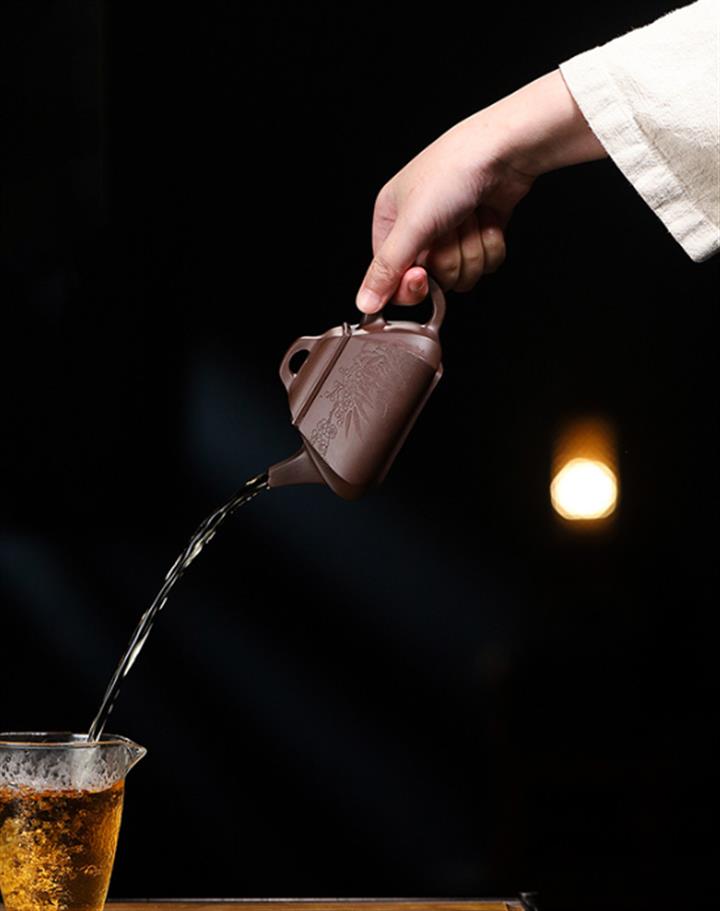 【泥料特點】砂土氣重,似淳實農民,日久使用,漸露鋒芒,養成變化,溫潤莊重。紫砂是壹種雙重氣孔結構的多孔性材質,氣孔微細,密度高。用紫砂壺沏茶,不失原味,且香不渙散,得茶之真香真味。紫砂使用越久,壺身色澤越發光亮照人,氣韻溫雅。紫砂壺長久使用器身會因撫摸擦拭,變得越發溫潤光澤。