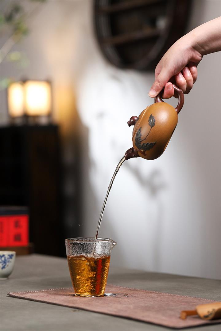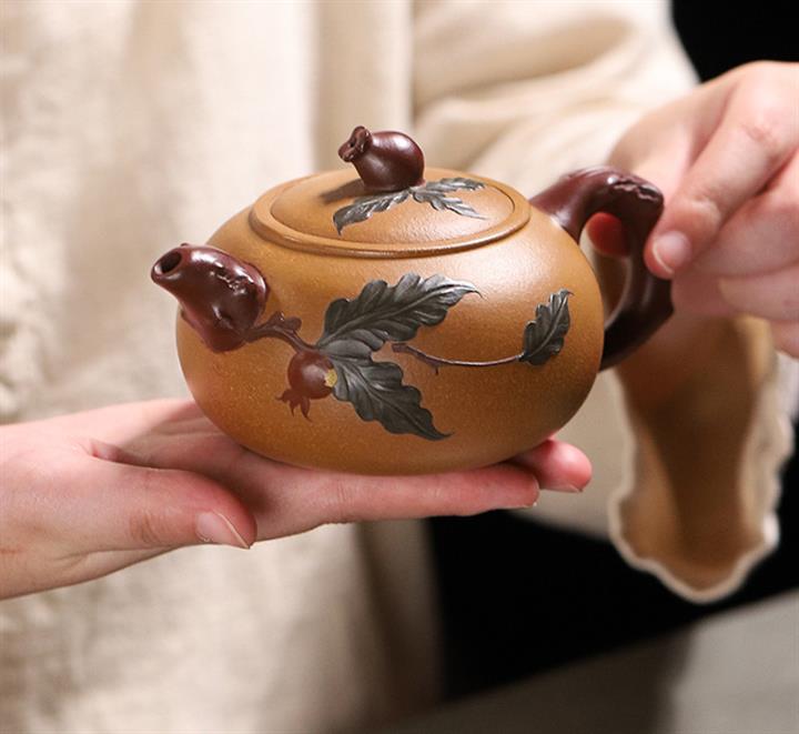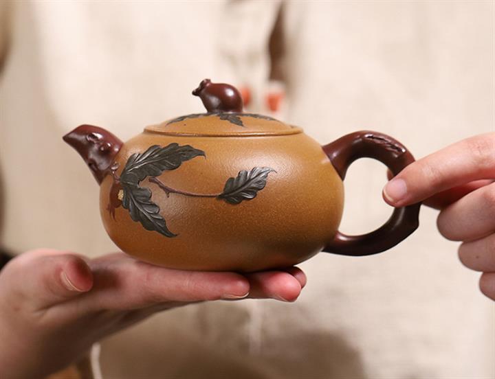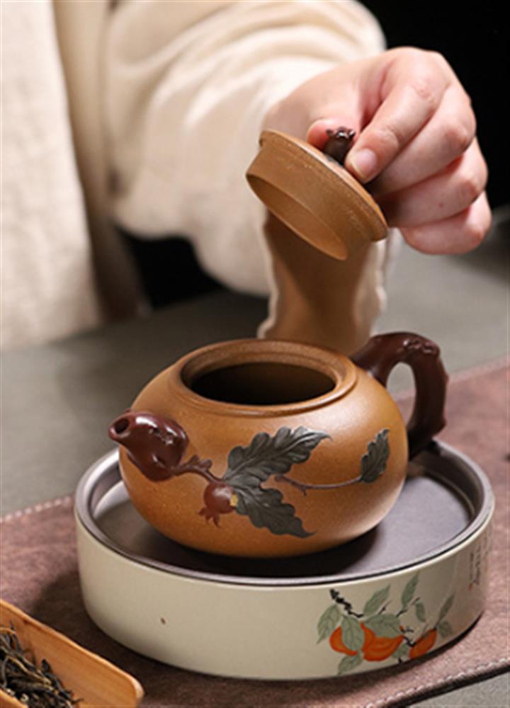 【泥料特點】砂土氣重,似淳實農民,日久使用,漸露鋒芒,養成變化,溫潤莊重。紫砂是壹種雙重氣孔結構的多孔性材質,氣孔微細,密度高。用紫砂壺沏茶,不失原味,且香不渙散,得茶之真香真味。紫砂使用越久,壺身色澤越發光亮照人,氣韻溫雅。紫砂壺長久使用器身會因撫摸擦拭,變得越發溫潤光澤。