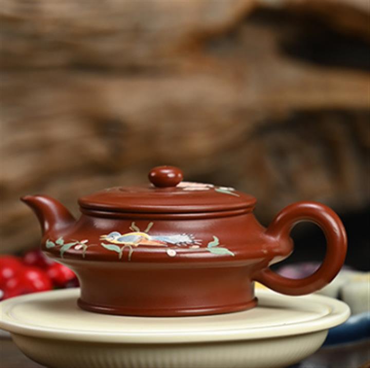 240cc原礦大紅袍彩繪花鳥虛扁茶壺POT8587