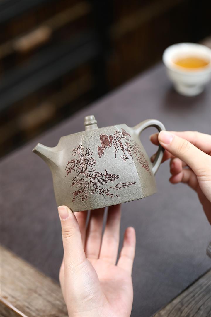【作品介紹】此款壺形線條流暢,壺把,壺嘴,壺身壹氣呵成栩栩如生,是收藏把玩的好壺,泥料色澤古樸典雅,日久使用,漸露鋒芒,養成變化快,溫潤莊重,用其泡茶,使用的年代久,壺身就溫潤,泡出來的茶湯也就醇郁芳馨。