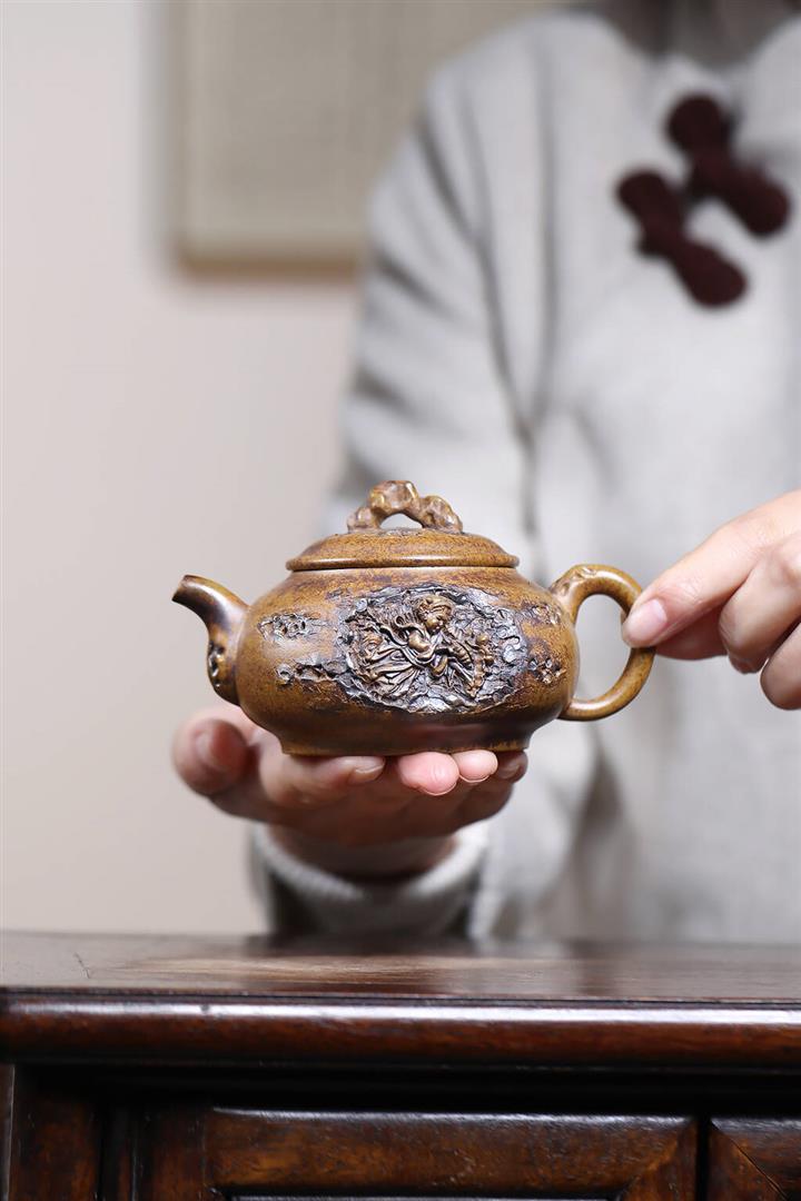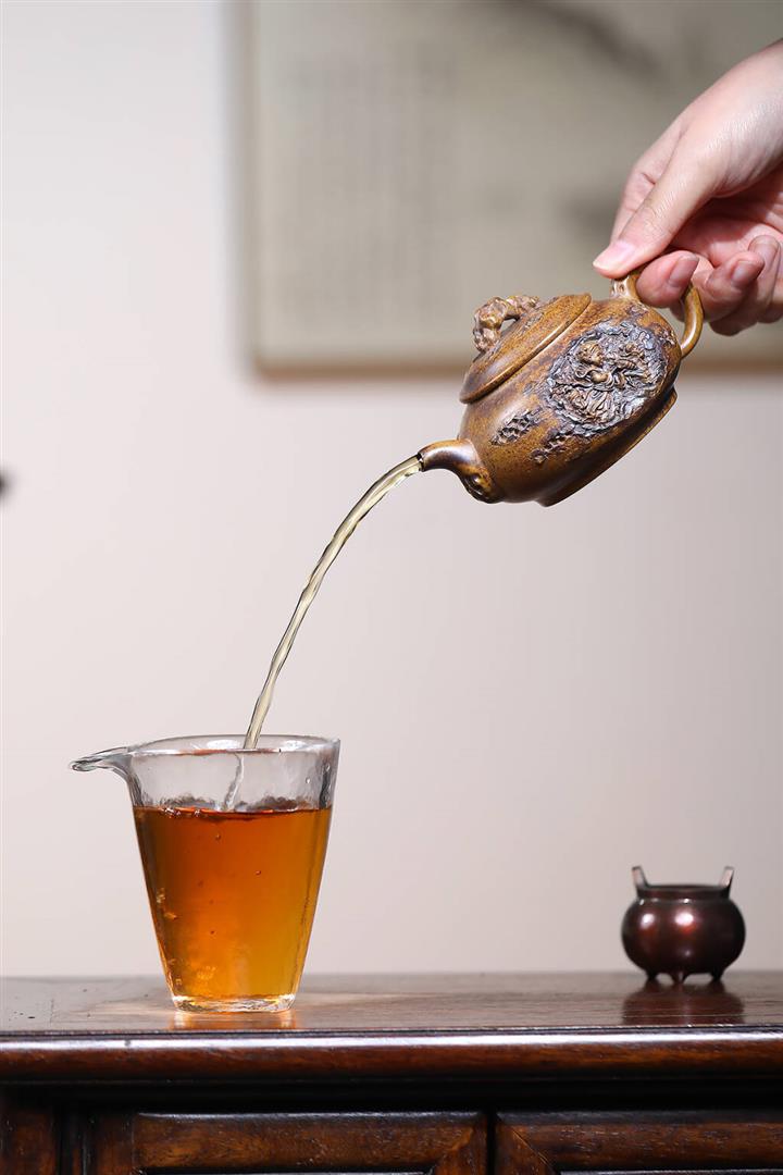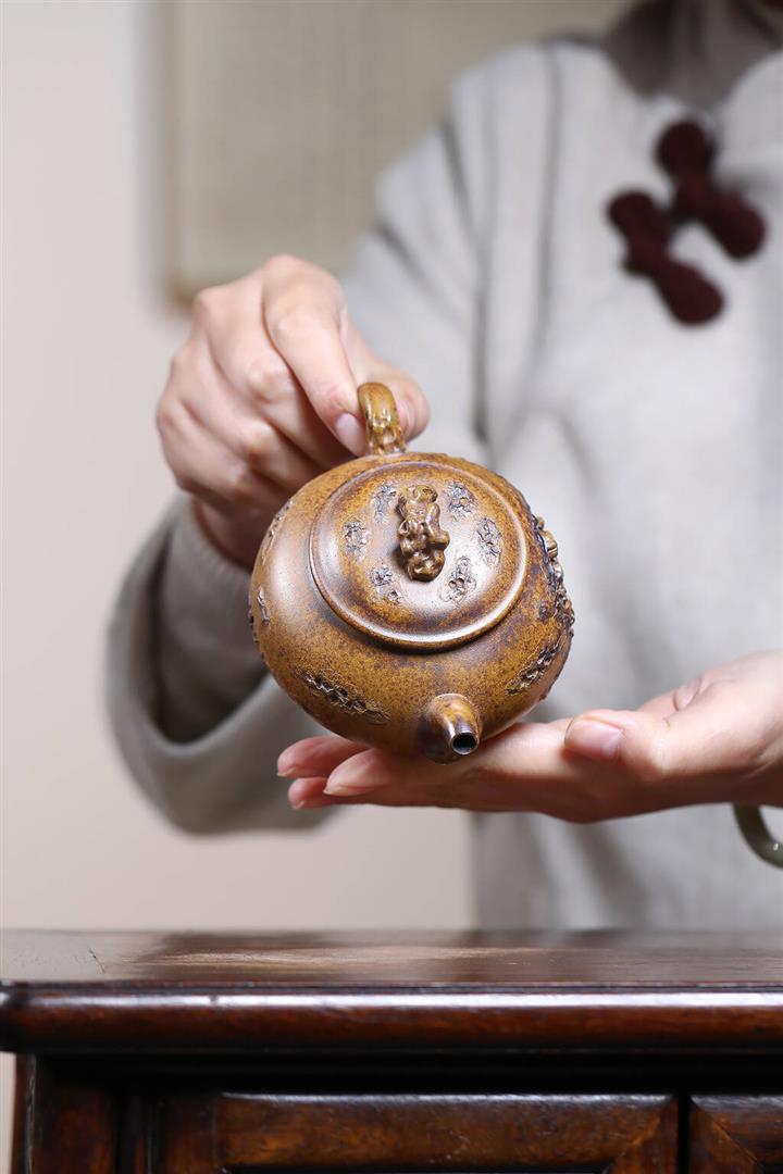 【泥料特點】砂土氣重,似淳實農民,日久使用,漸露鋒芒,養成變化,溫潤莊重。紫砂是壹種雙重氣孔結構的多孔性材質,氣孔微細,密度高。用紫砂壺沏茶,不失原味,且香不渙散,得茶之真香真味。紫砂使用越久,壺身色澤越發光亮照人,氣韻溫雅。紫砂壺長久使用器身會因撫摸擦拭,變得越發溫潤光澤。