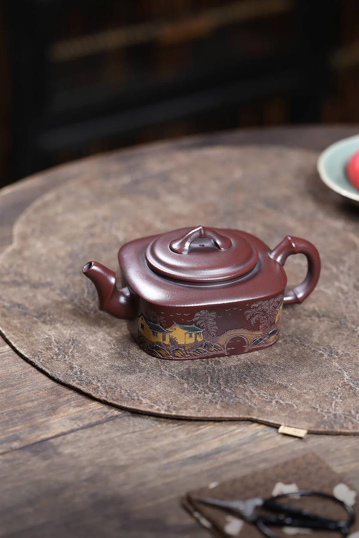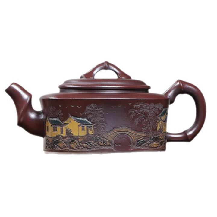240cc龍山古烏泥彩刻山水四方竹段茶壺POT9014
