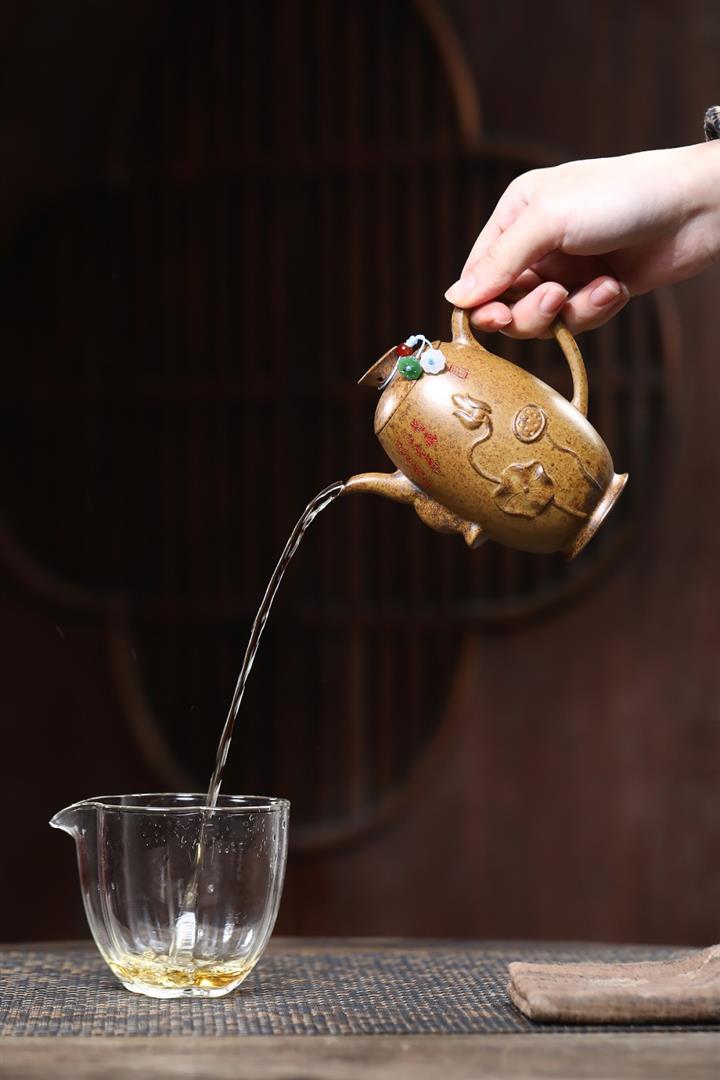 【泥料特點】砂土氣重,似淳實農民,日久使用,漸露鋒芒,養成變化,溫潤莊重。紫砂是壹種雙重氣孔結構的多孔性材質,氣孔微細,密度高。用紫砂壺沏茶,不失原味,且香不渙散,得茶之真香真味。紫砂使用越久,壺身色澤越發光亮照人,氣韻溫雅。紫砂壺長久使用器身會因撫摸擦拭,變得越發溫潤光澤。
