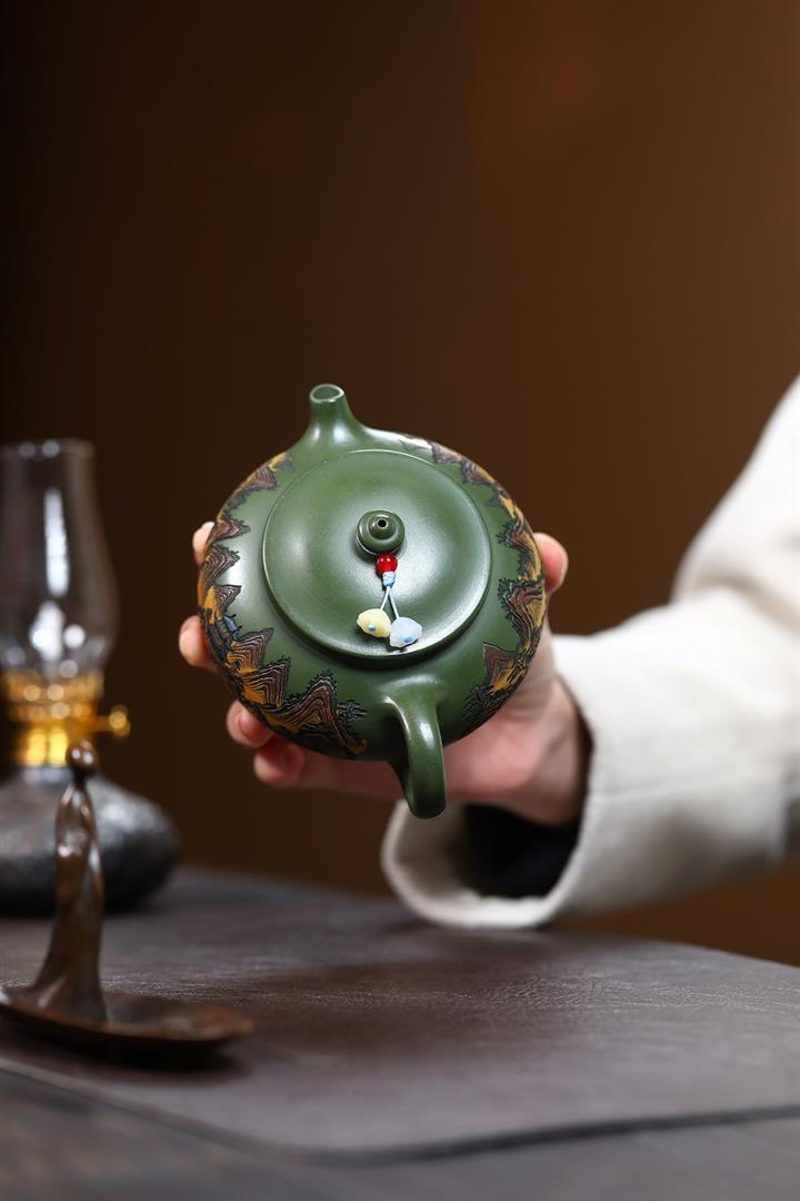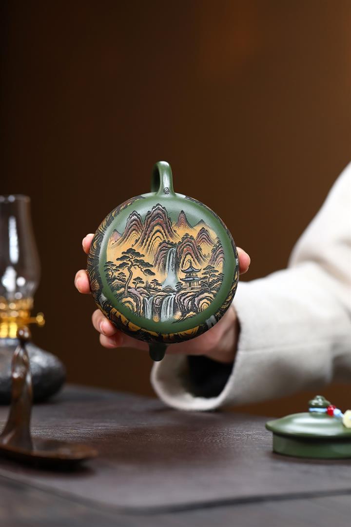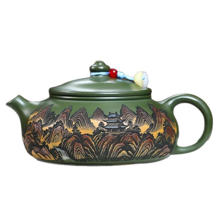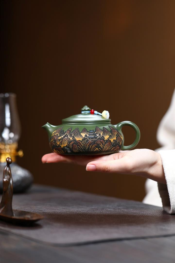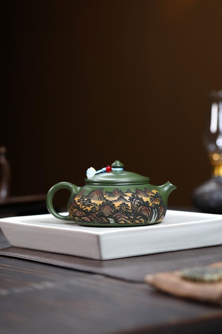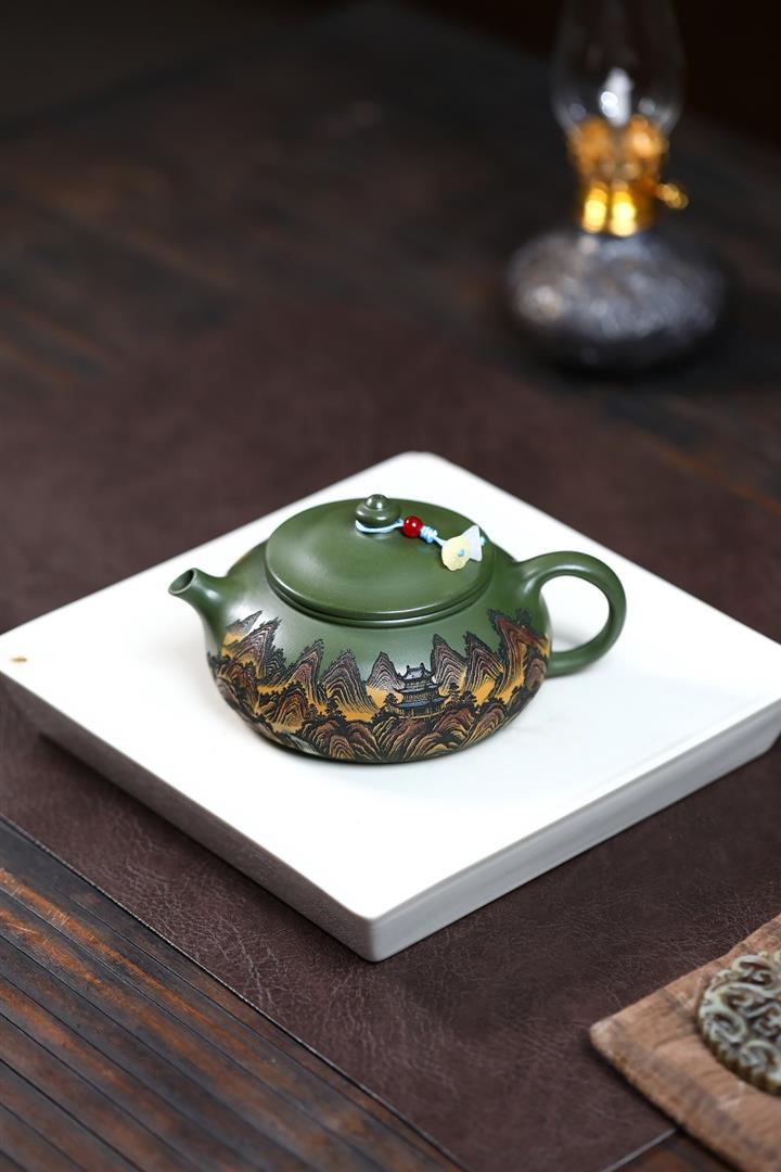 原礦墨綠泥手工刻畫山水仿古茶壺POT6930