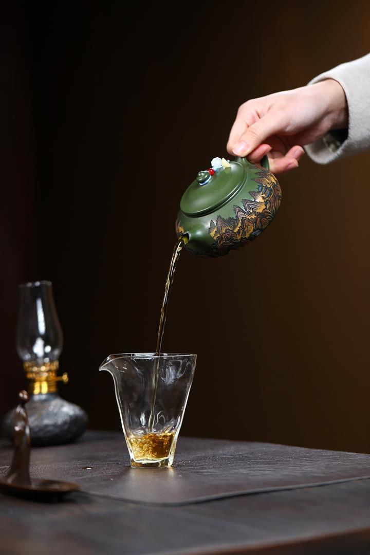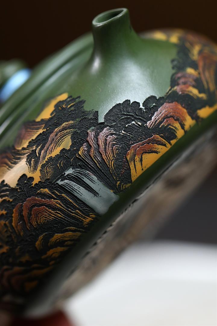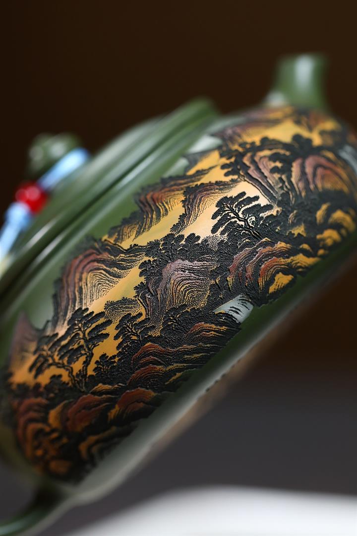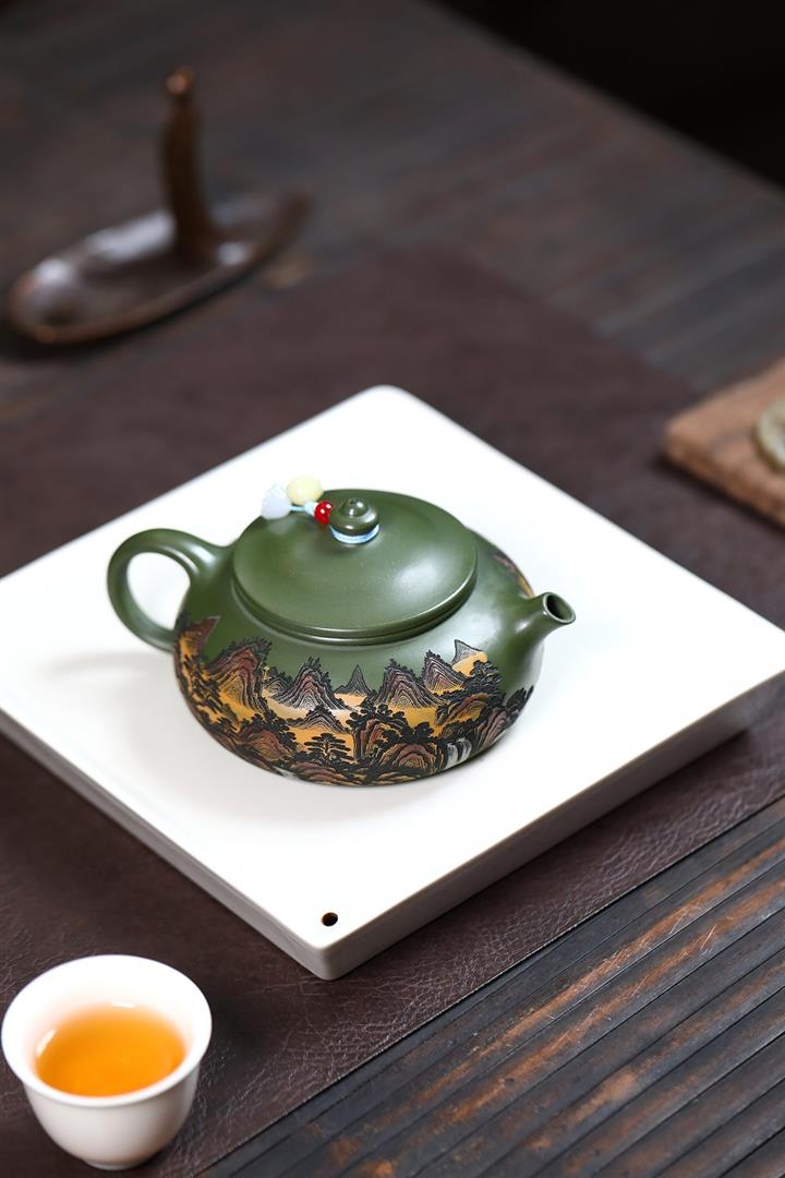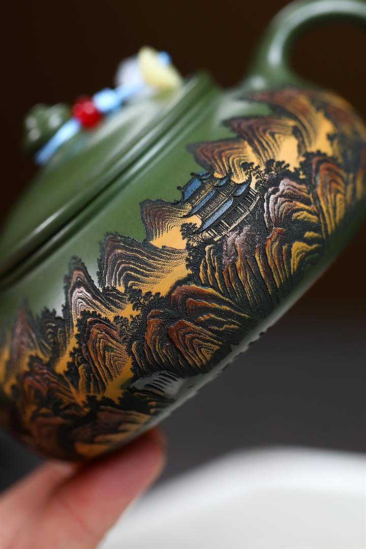 原礦墨綠泥手工刻畫山水仿古茶壺POT6930