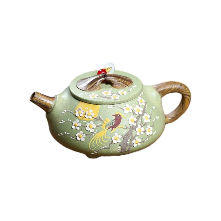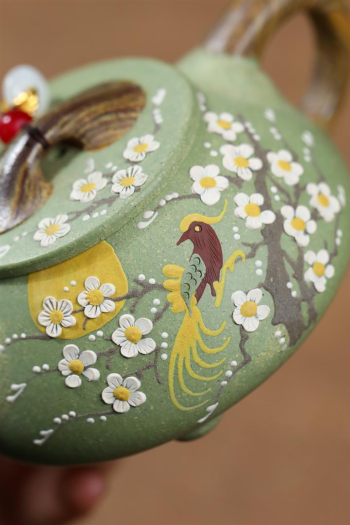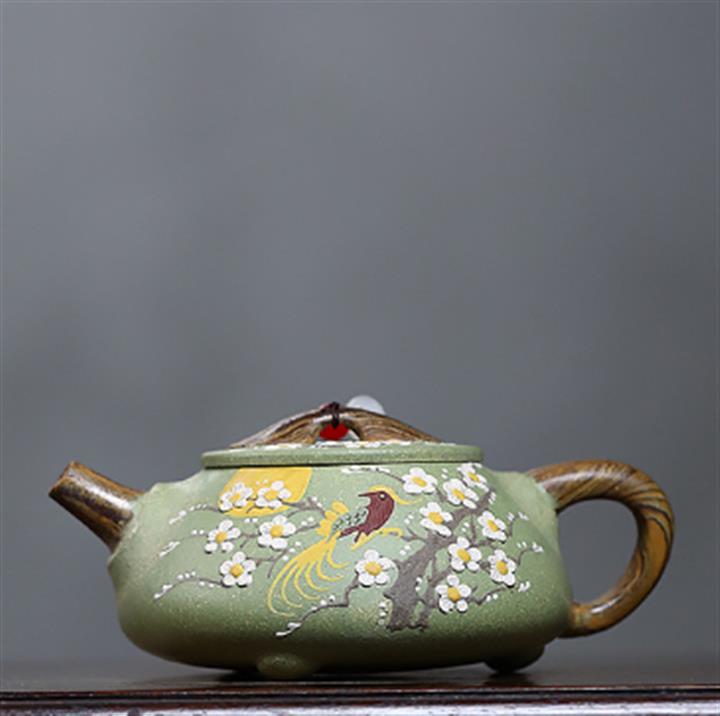 200cc原礦豆青砂絞泥喜上梅梢泡茶壺POT9479