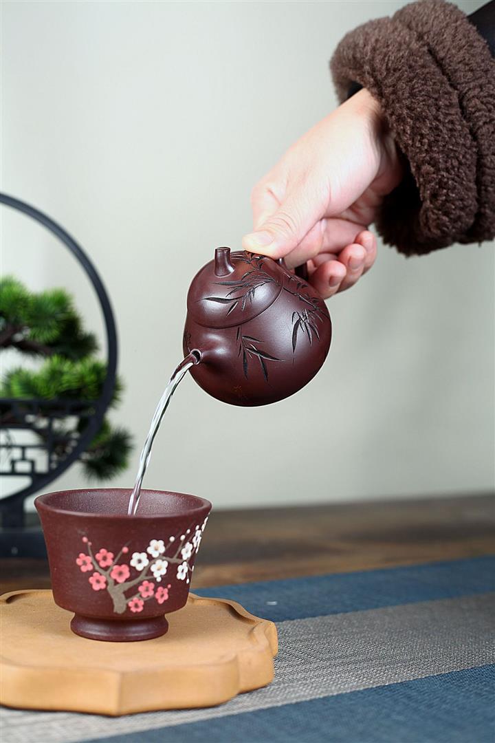 【泥料特點】砂土氣重,似淳實農民,日久使用,漸露鋒芒,養成變化,溫潤莊重。紫砂是壹種雙重氣孔結構的多孔性材質,氣孔微細,密度高。用紫砂壺沏茶,不失原味,且香不渙散,得茶之真香真味。紫砂使用越久,壺身色澤越發光亮照人,氣韻溫雅。紫砂壺長久使用器身會因撫摸擦拭,變得越發溫潤光澤。