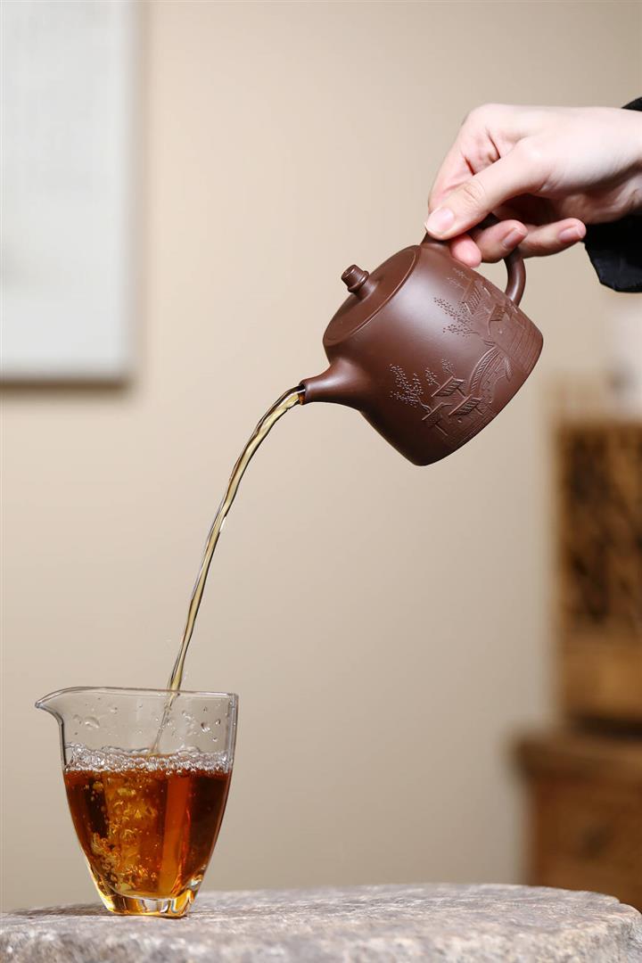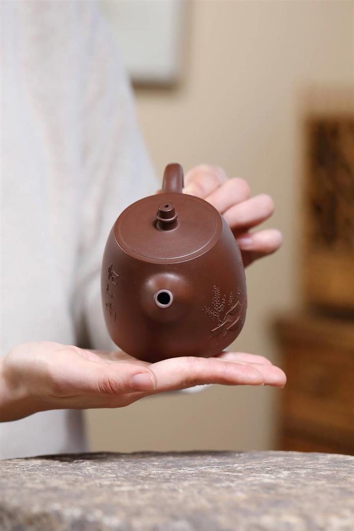 【泥料特點】砂土氣重,似淳實農民,日久使用,漸露鋒芒,養成變化,溫潤莊重。紫砂是壹種雙重氣孔結構的多孔性材質,氣孔微細,密度高。用紫砂壺沏茶,不失原味,且香不渙散,得茶之真香真味。紫砂使用越久,壺身色澤越發光亮照人,氣韻溫雅。紫砂壺長久使用器身會因撫摸擦拭,變得越發溫潤光澤。