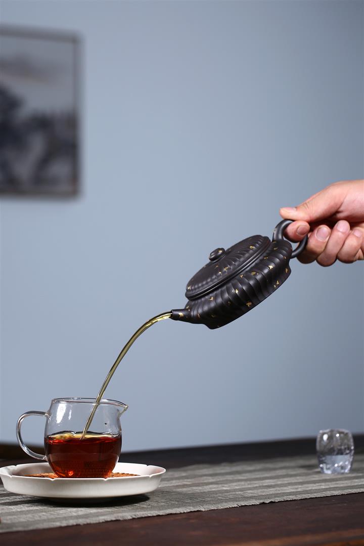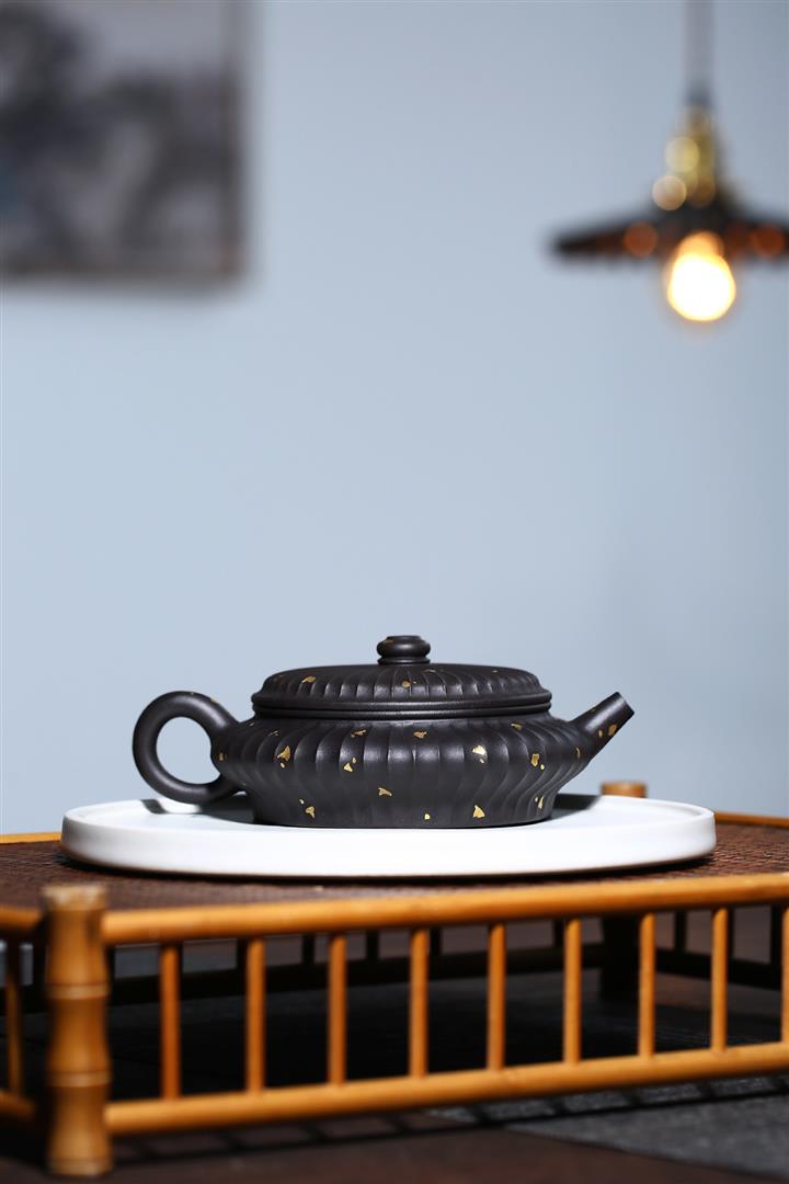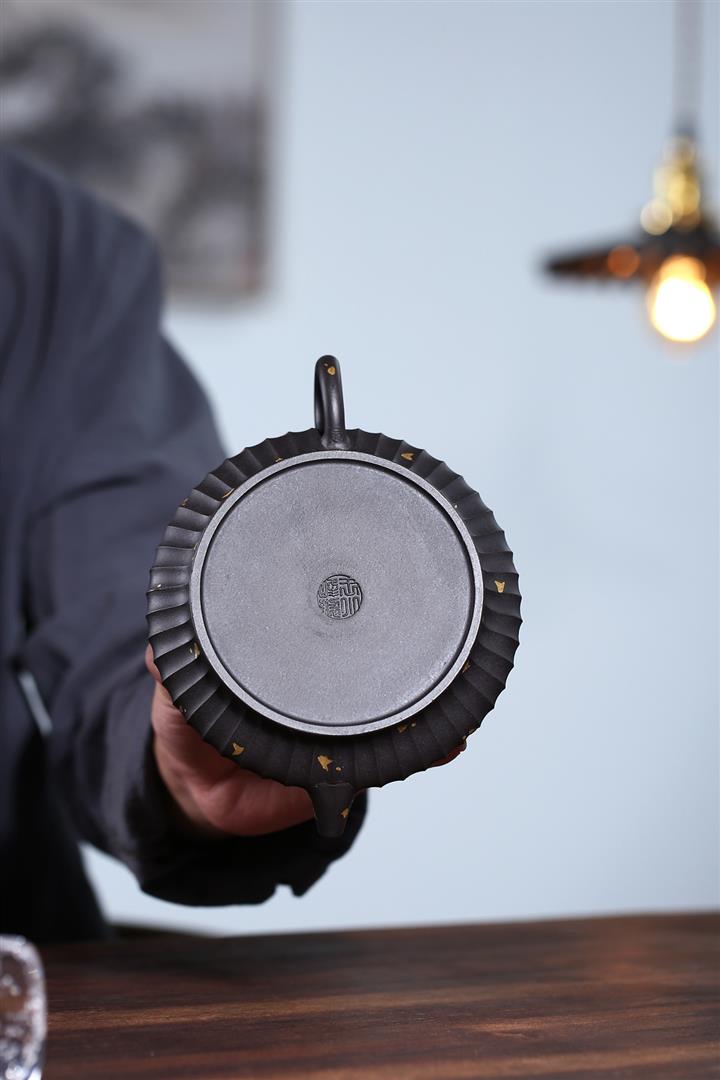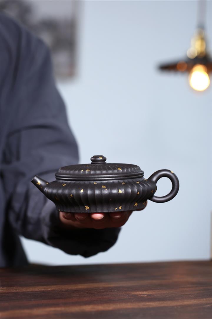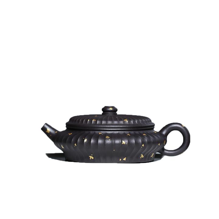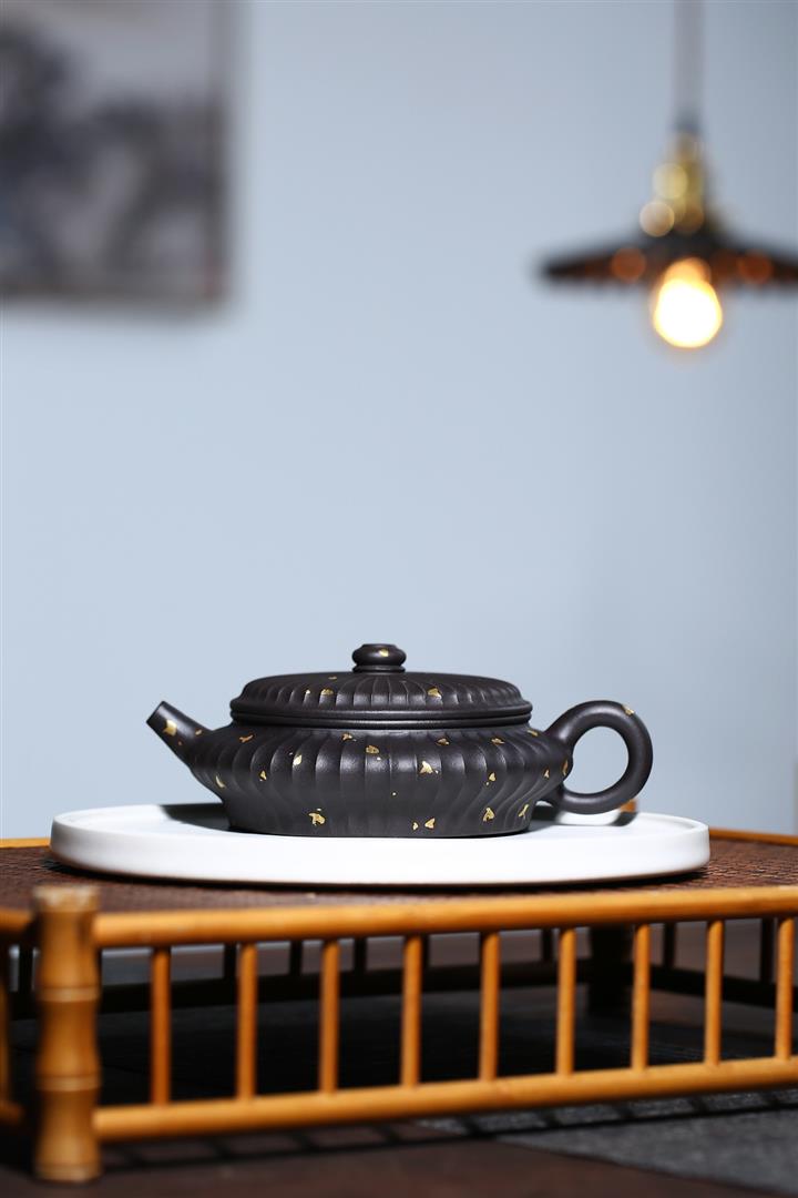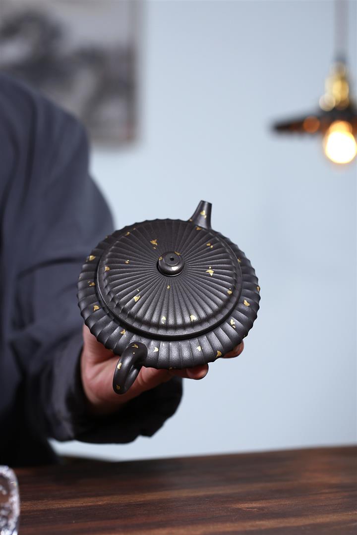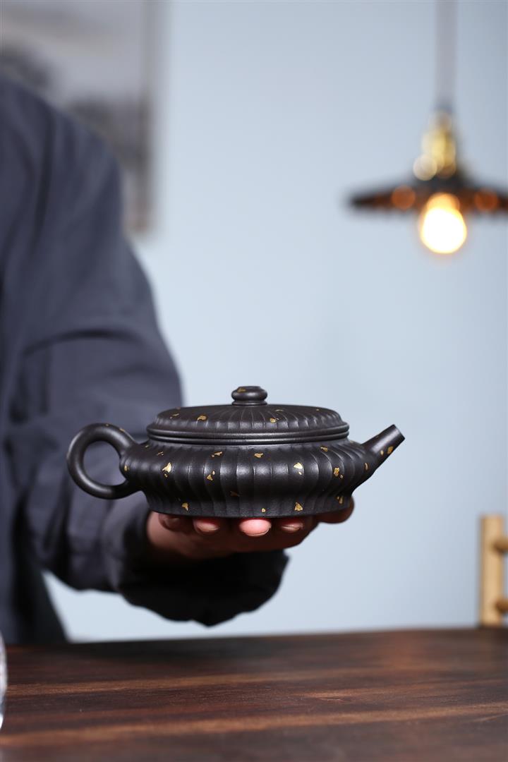 280cc原礦黑料描撒灑金筋紋虛扁茶壺POT8153