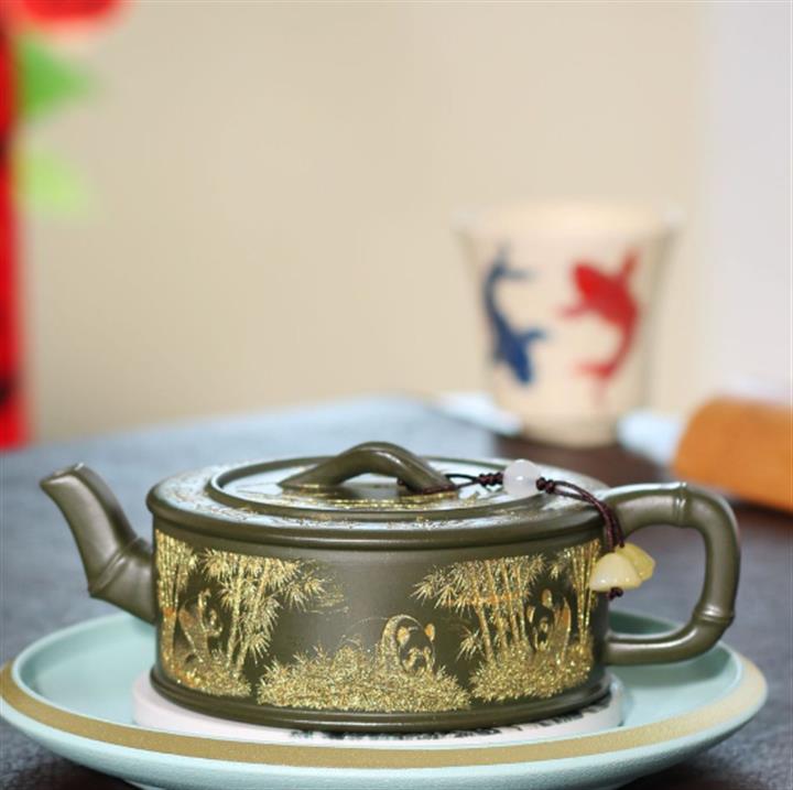 190cc原礦綠泥虛扁熊貓竹段茶壺POT8207