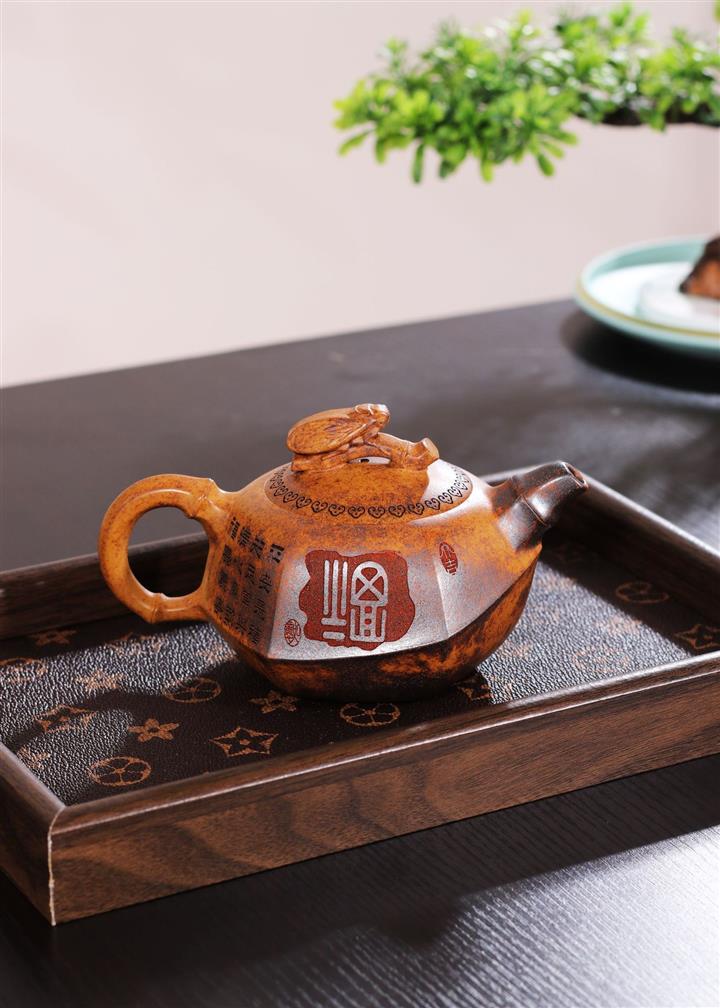 【泥料特點】砂土氣重,似淳實農民,日久使用,漸露鋒芒,養成變化,溫潤莊重。紫砂是壹種雙重氣孔結構的多孔性材質,氣孔微細,密度高。用紫砂壺沏茶,不失原味,且香不渙散,得茶之真香真味。紫砂使用越久,壺身色澤越發光亮照人,氣韻溫雅。紫砂壺長久使用器身會因撫摸擦拭,變得越發溫潤光澤。