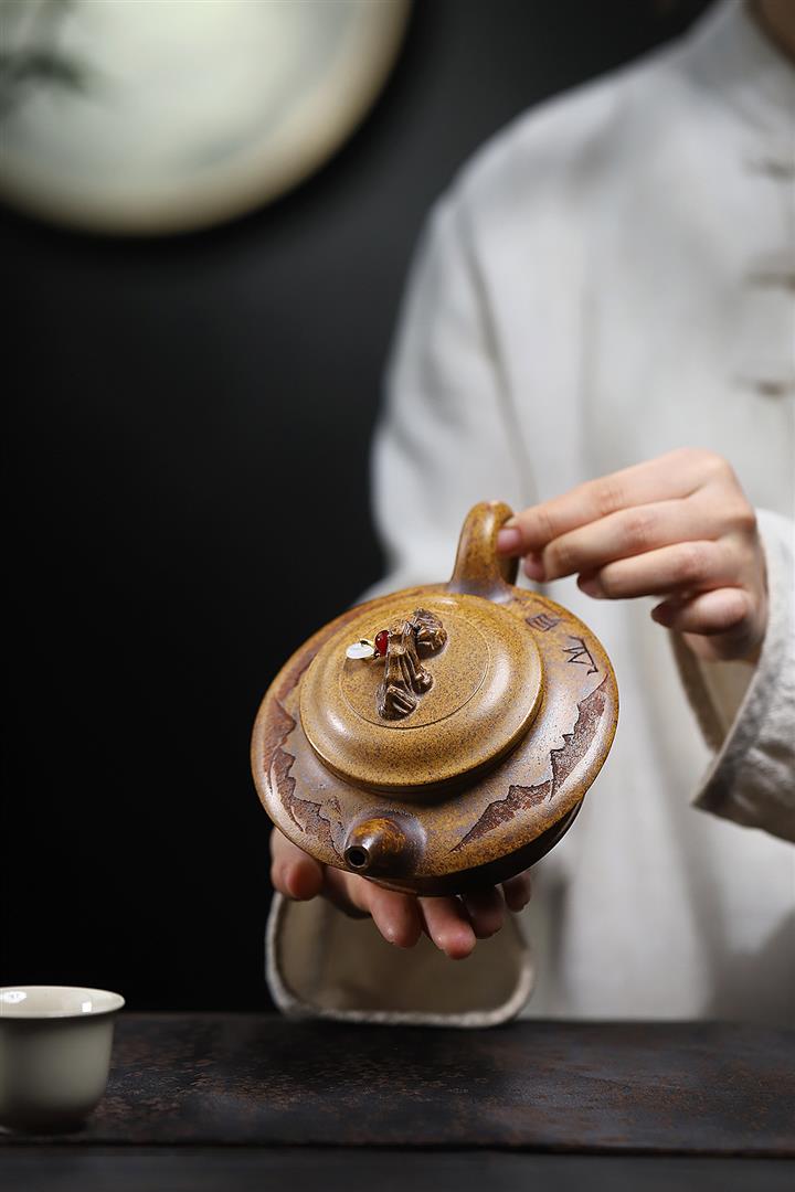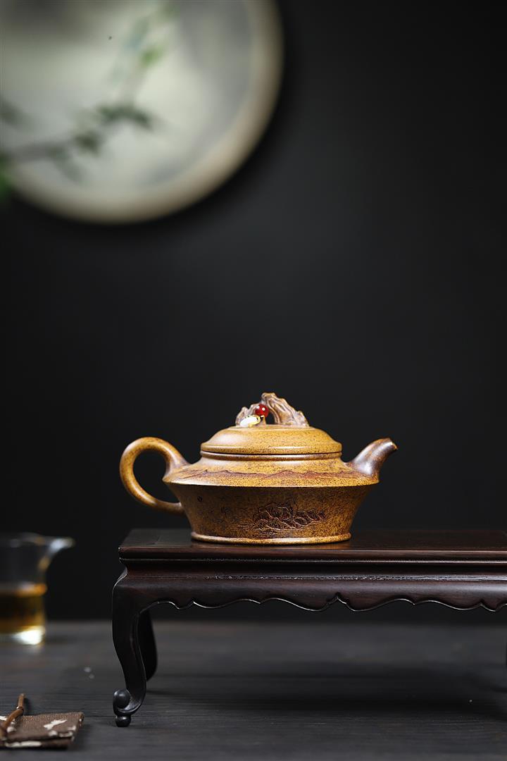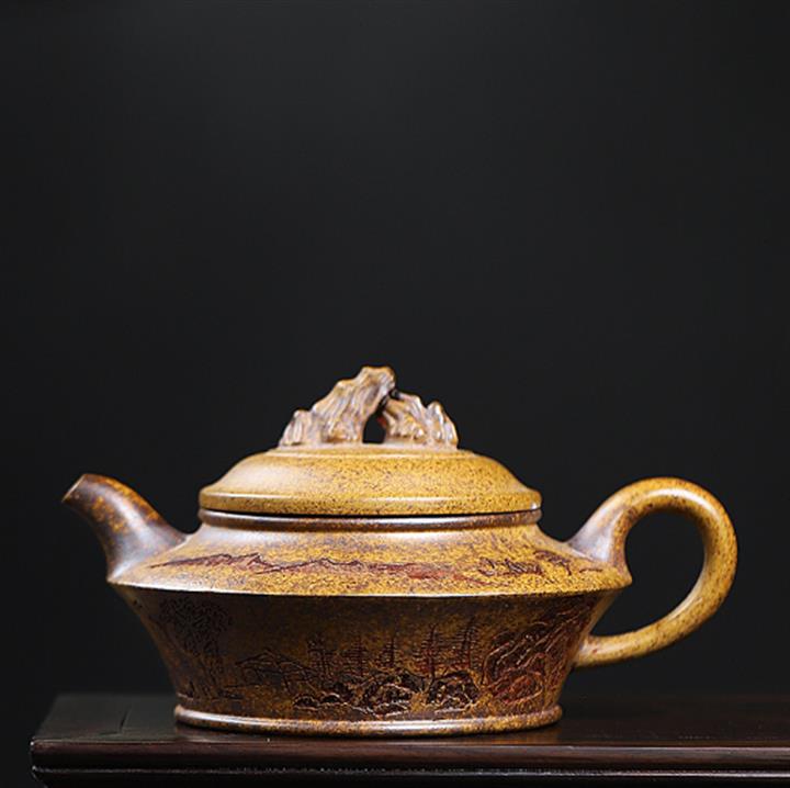 300cc原礦高溫段泥刻繪觀山虛扁茶壺POT8210