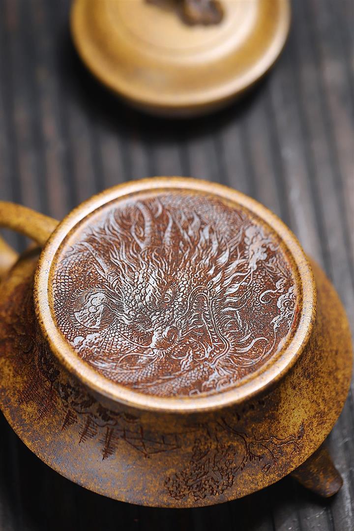 280cc原礦墨綠泥滿刻鯉躍荷塘茶壺POT8320