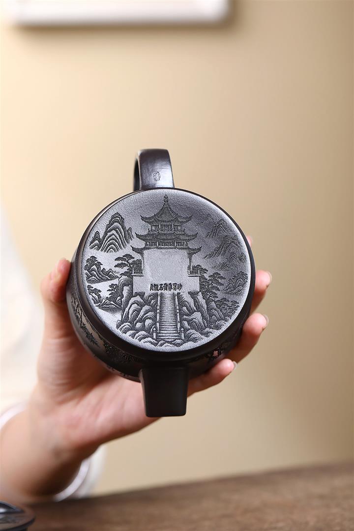 原礦豆青泥純手刻繪靜心壺茶壺紫砂壺 pot3390