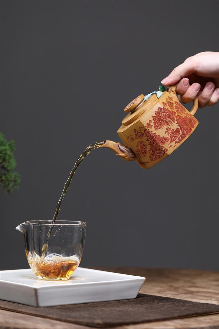 原礦墨綠泥手工滿刻觀山洋桶茶壺POT7107