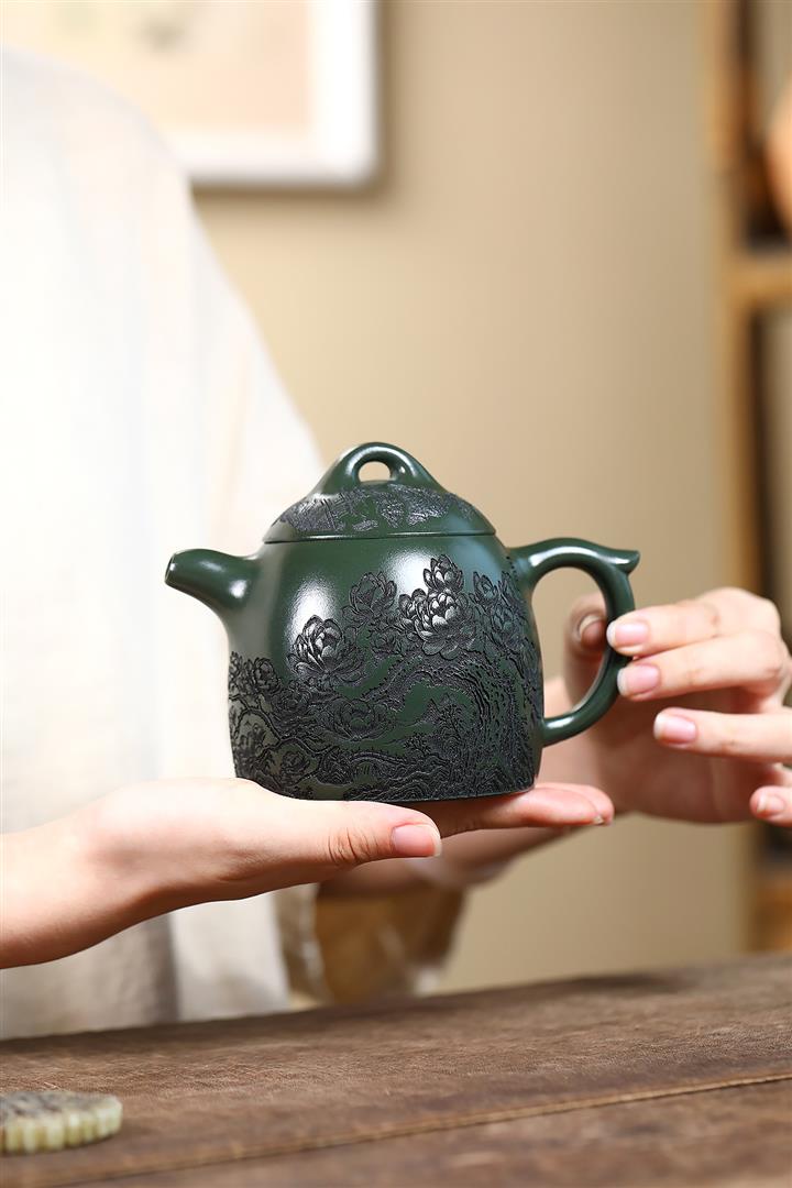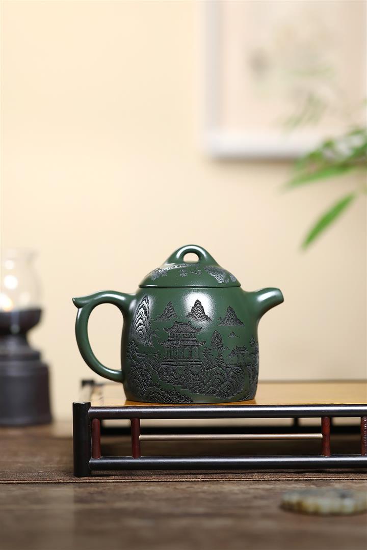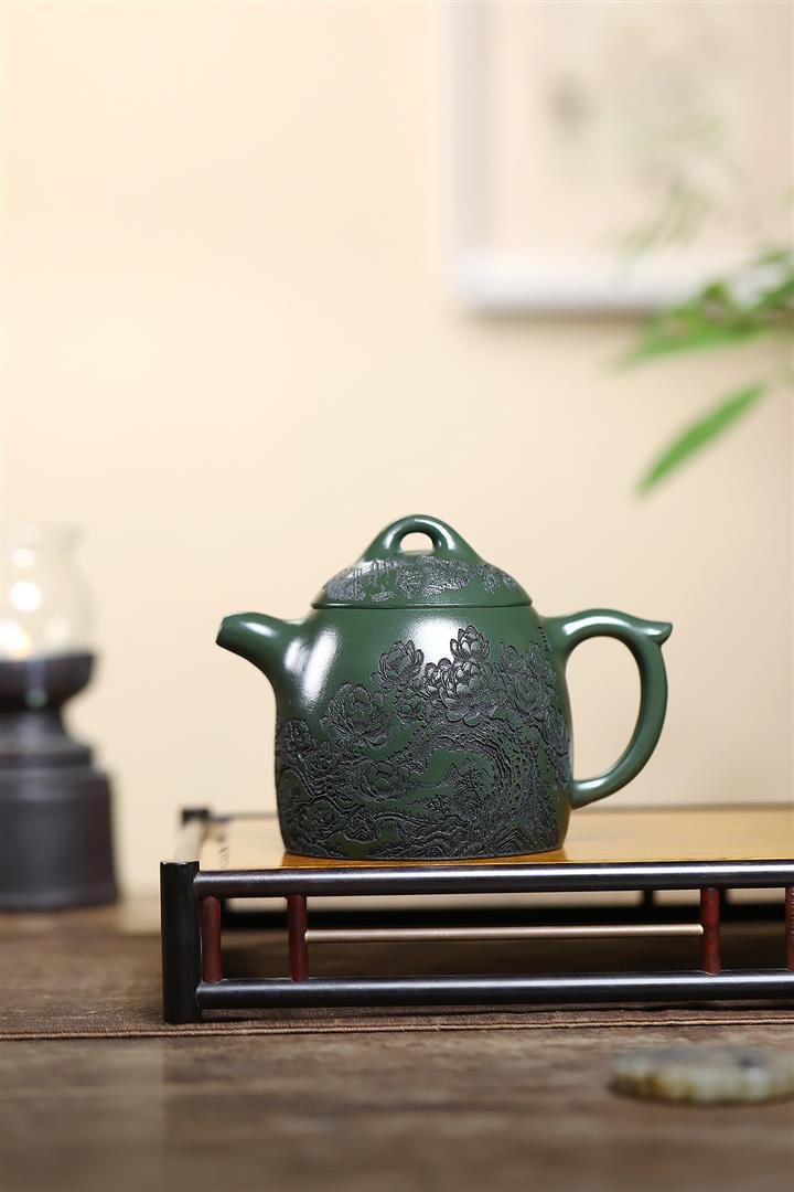 450cc原礦翡翠綠泥滿刻秦權茶壺POT8279