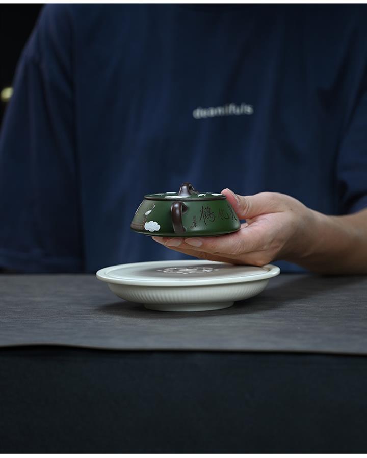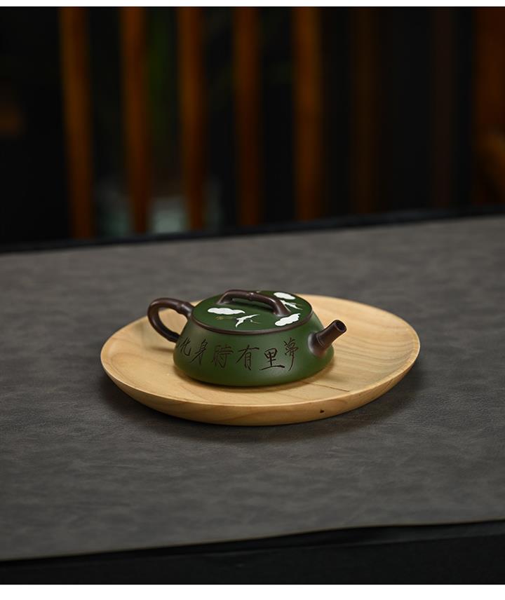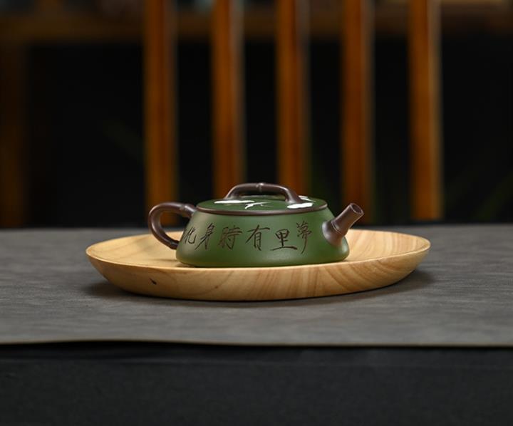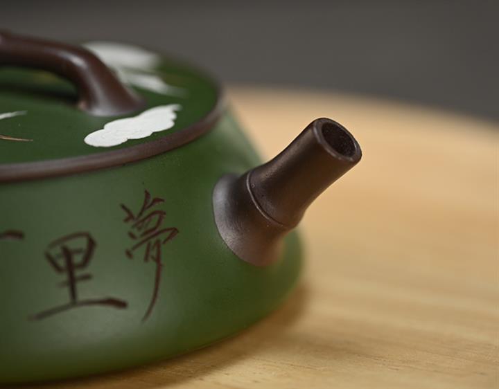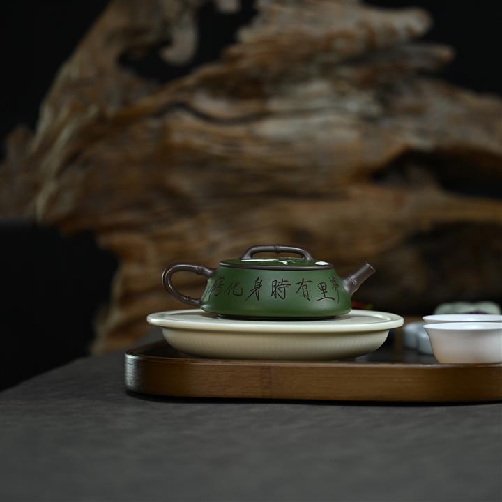 原礦綠泥手工刻繪竹影秦權炮嘴茶壺POT6751