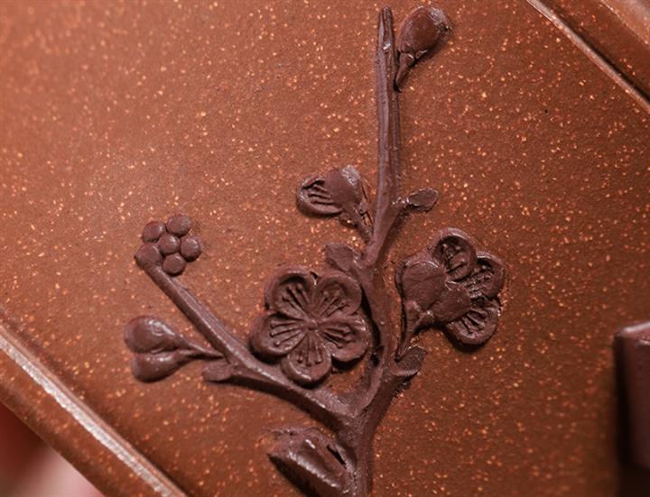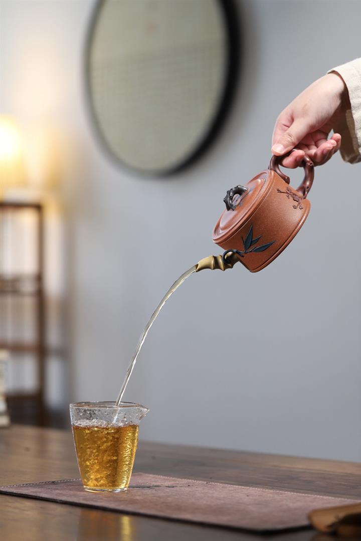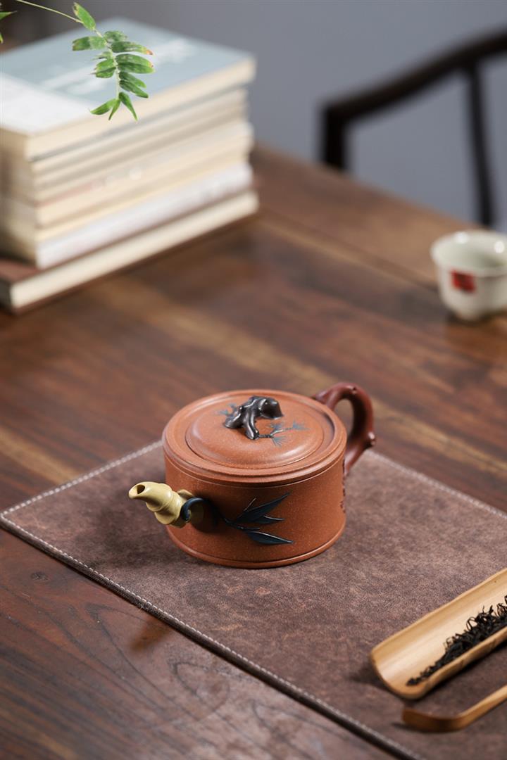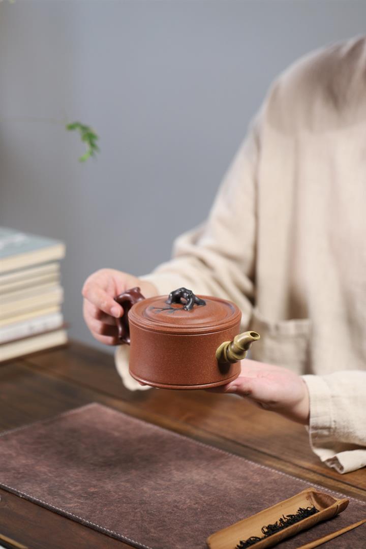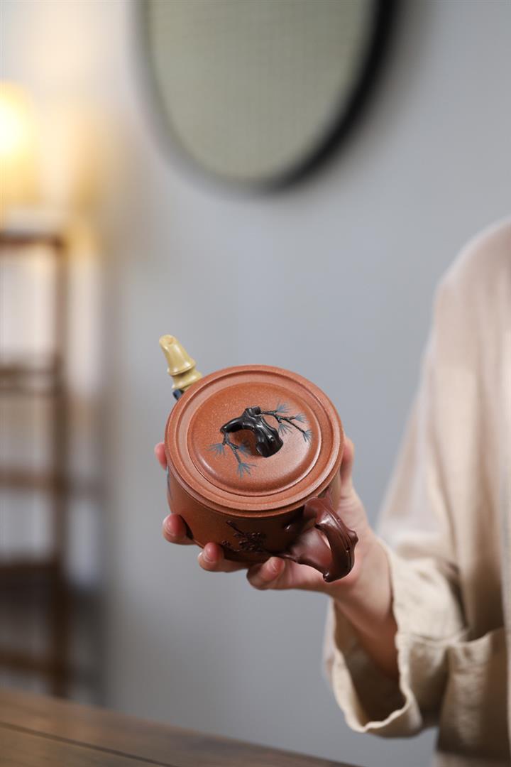 【泥料特點】砂土氣重,似淳實農民,日久使用,漸露鋒芒,養成變化,溫潤莊重。紫砂是壹種雙重氣孔結構的多孔性材質,氣孔微細,密度高。用紫砂壺沏茶,不失原味,且香不渙散,得茶之真香真味。紫砂使用越久,壺身色澤越發光亮照人,氣韻溫雅。紫砂壺長久使用器身會因撫摸擦拭,變得越發溫潤光澤。