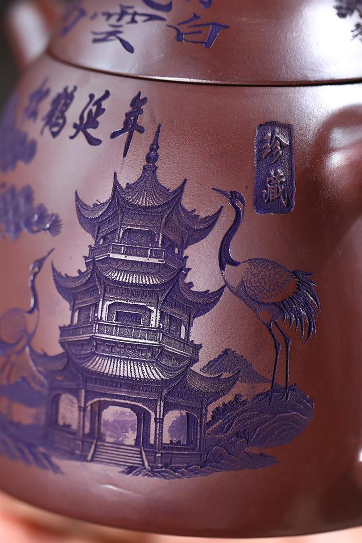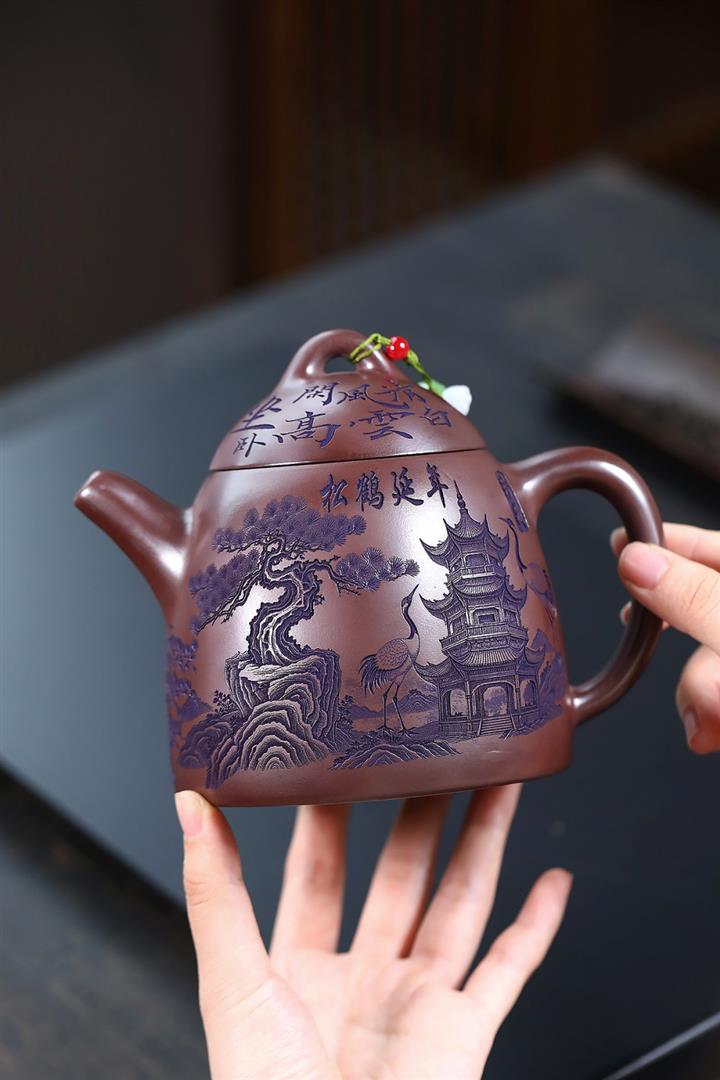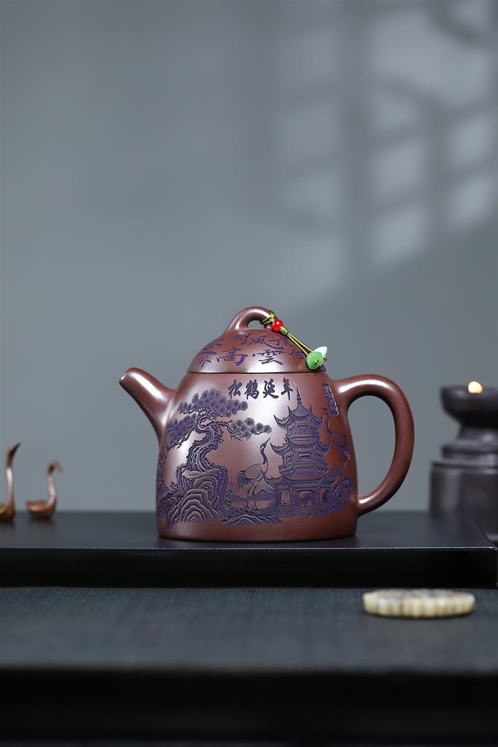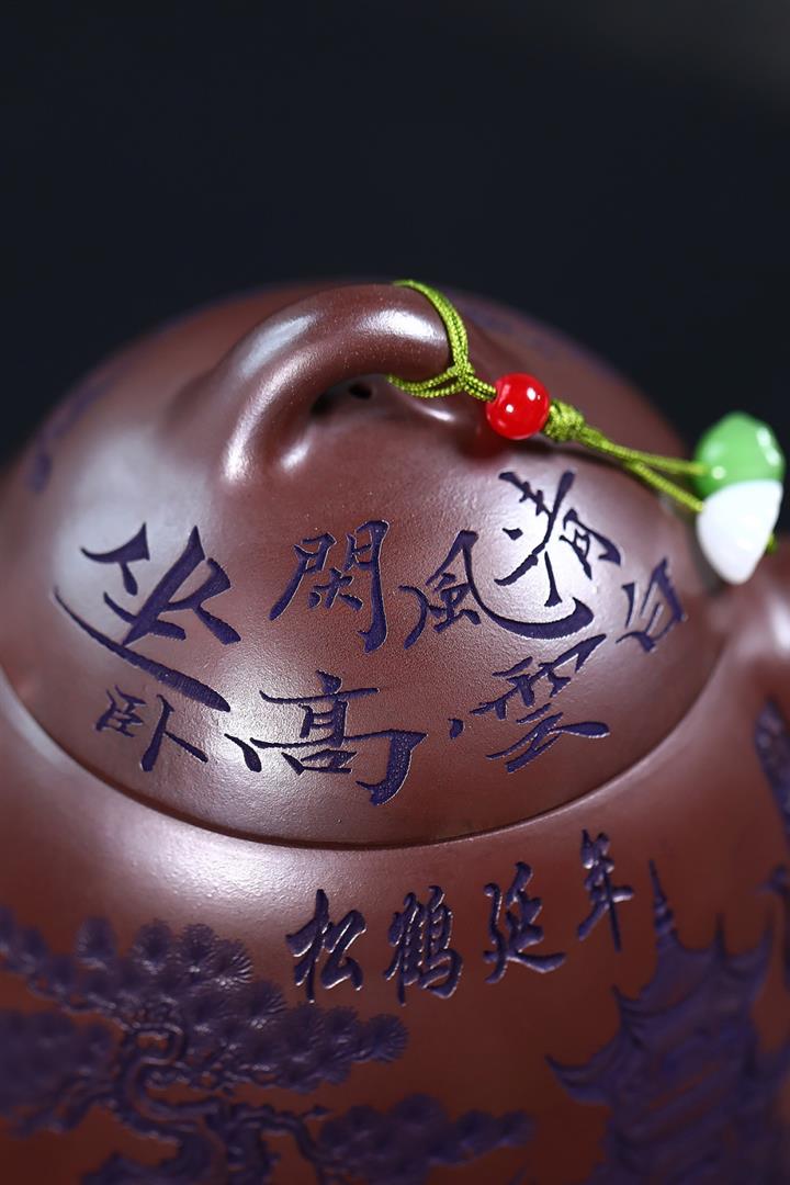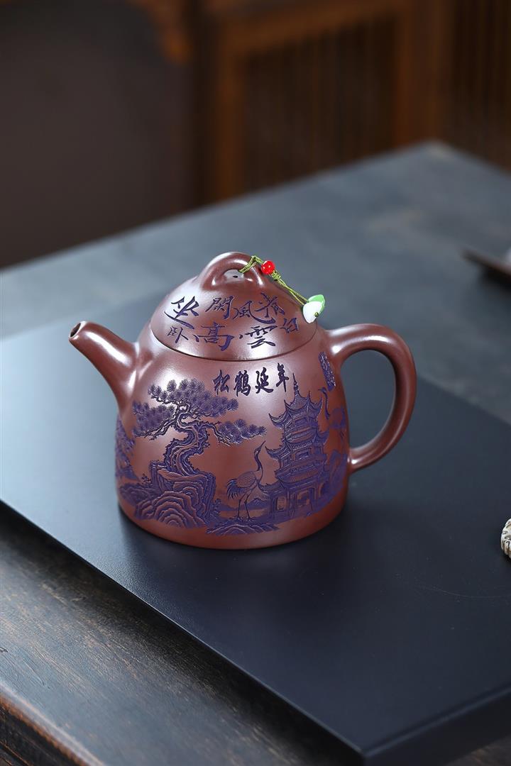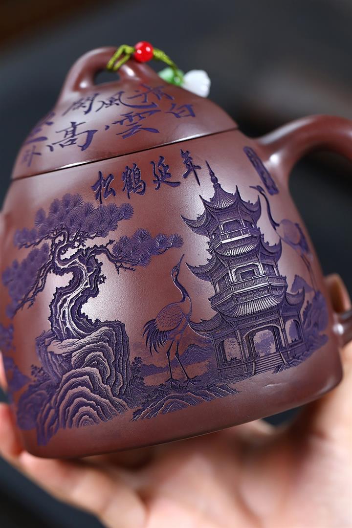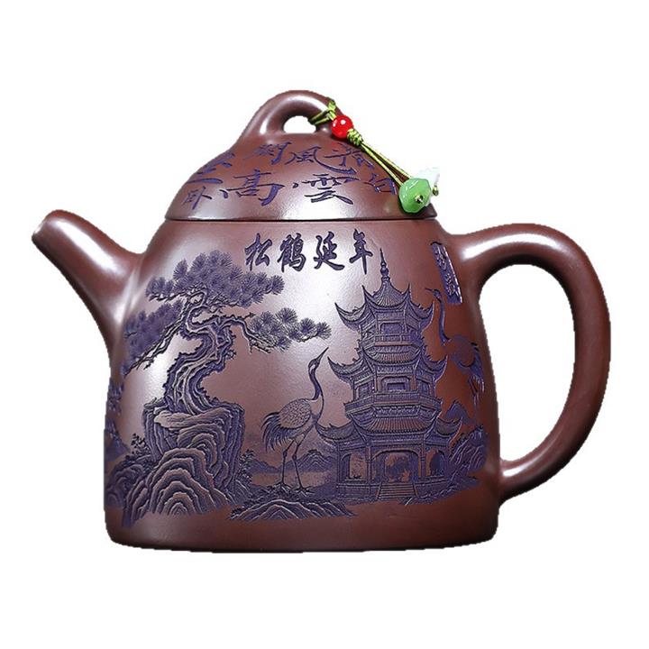 660cc原礦石紅泥滿刻山河鶴影茶壺POT8551