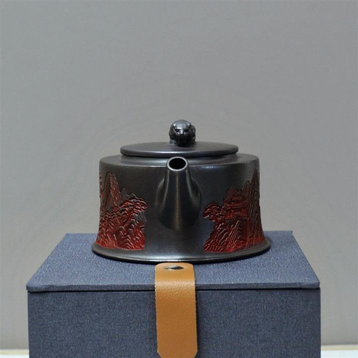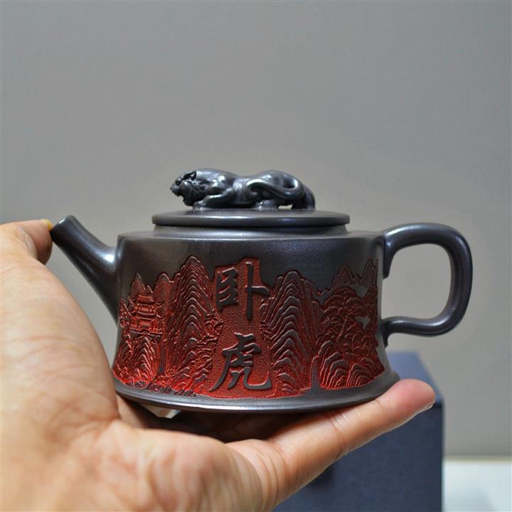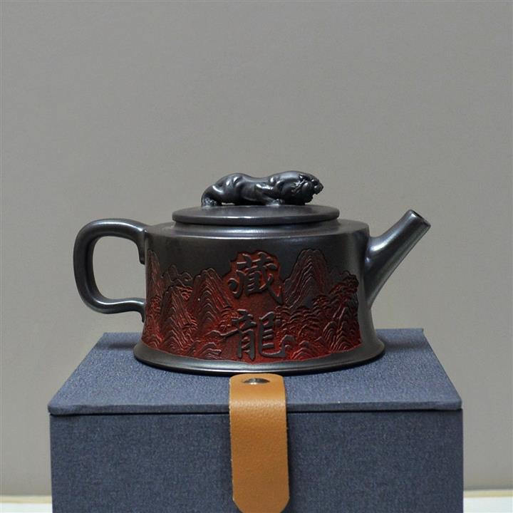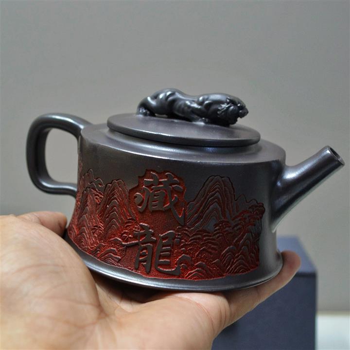原礦龍血砂手工刻繪龍珠紫砂壺