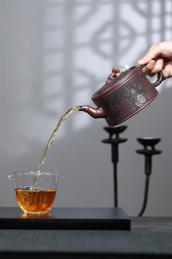 【泥料特點】砂土氣重,似淳實農民,日久使用,漸露鋒芒,養成變化,溫潤莊重。紫砂是壹種雙重氣孔結構的多孔性材質,氣孔微細,密度高。用紫砂壺沏茶,不失原味,且香不渙散,得茶之真香真味。紫砂使用越久,壺身色澤越發光亮照人,氣韻溫雅。紫砂壺長久使用器身會因撫摸擦拭,變得越發溫潤光澤。
