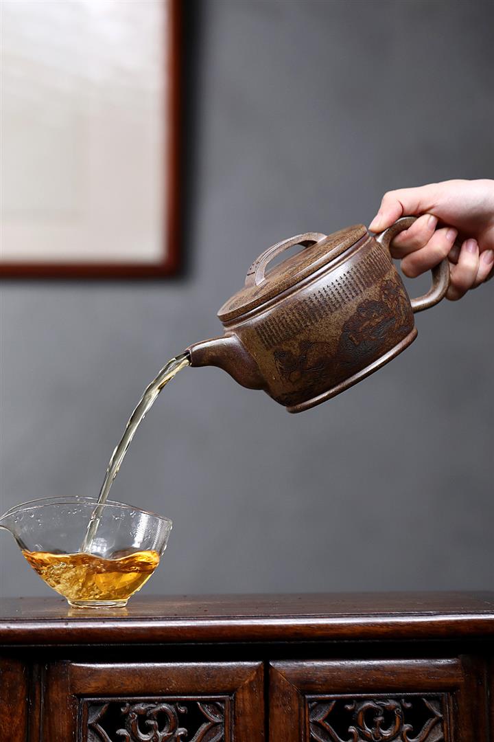【泥料特點】砂土氣重,似淳實農民,日久使用,漸露鋒芒,養成變化,溫潤莊重。紫砂是壹種雙重氣孔結構的多孔性材質,氣孔微細,密度高。用紫砂壺沏茶,不失原味,且香不渙散,得茶之真香真味。紫砂使用越久,壺身色澤越發光亮照人,氣韻溫雅。紫砂壺長久使用器身會因撫摸擦拭,變得越發溫潤光澤。