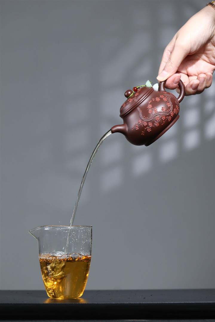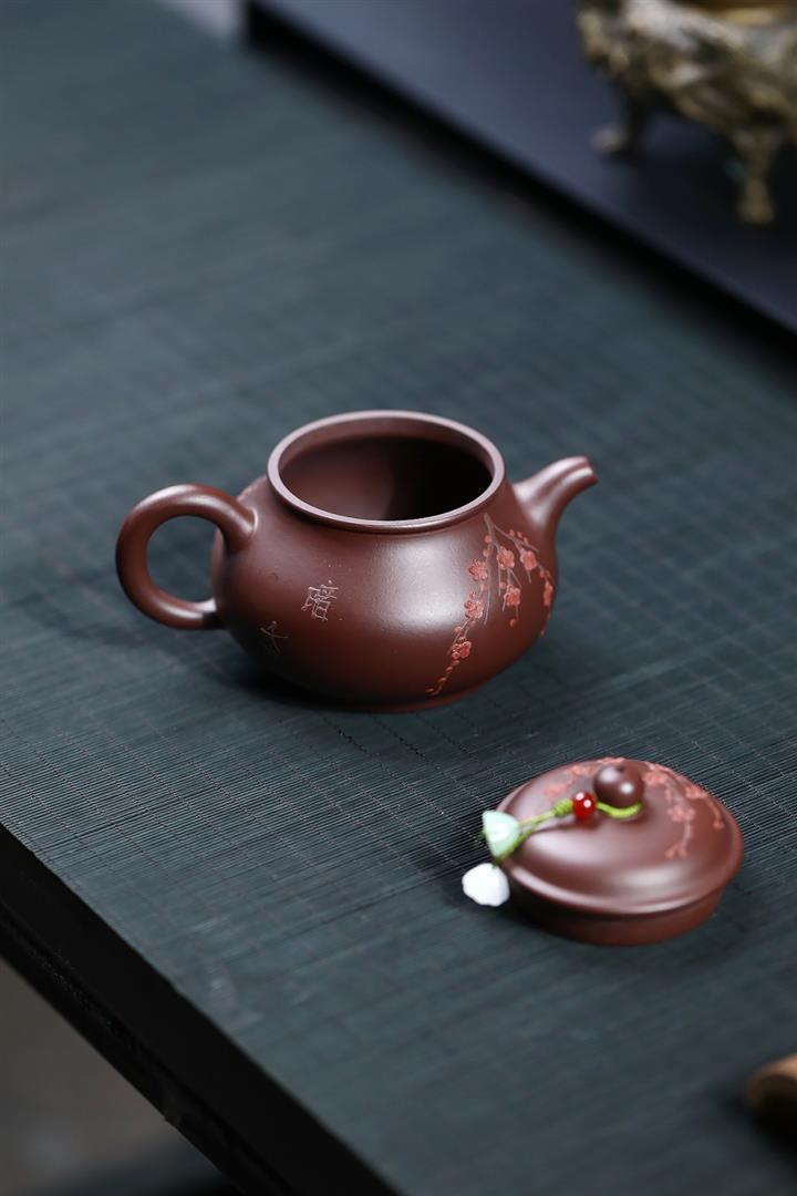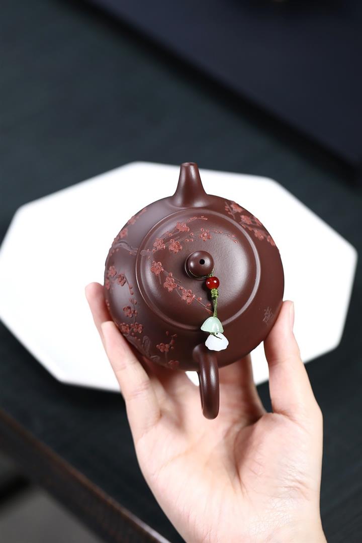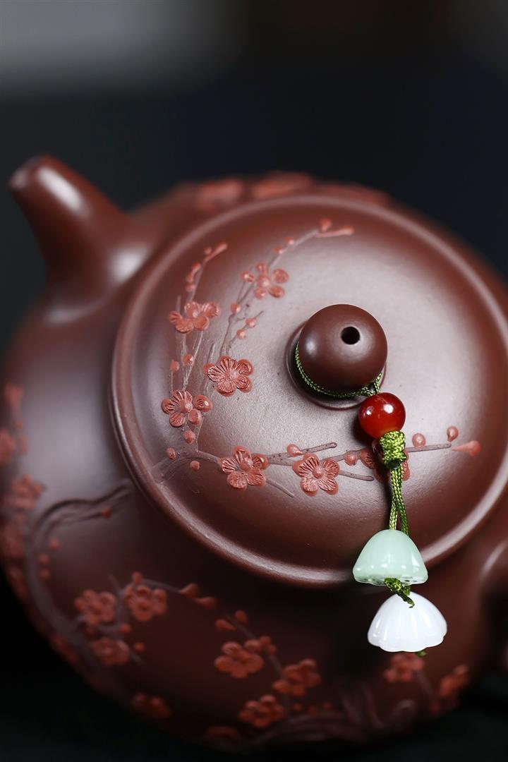 【泥料特點】砂土氣重,似淳實農民,日久使用,漸露鋒芒,養成變化,溫潤莊重。紫砂是壹種雙重氣孔結構的多孔性材質,氣孔微細,密度高。用紫砂壺沏茶,不失原味,且香不渙散,得茶之真香真味。紫砂使用越久,壺身色澤越發光亮照人,氣韻溫雅。紫砂壺長久使用器身會因撫摸擦拭,變得越發溫潤光澤。