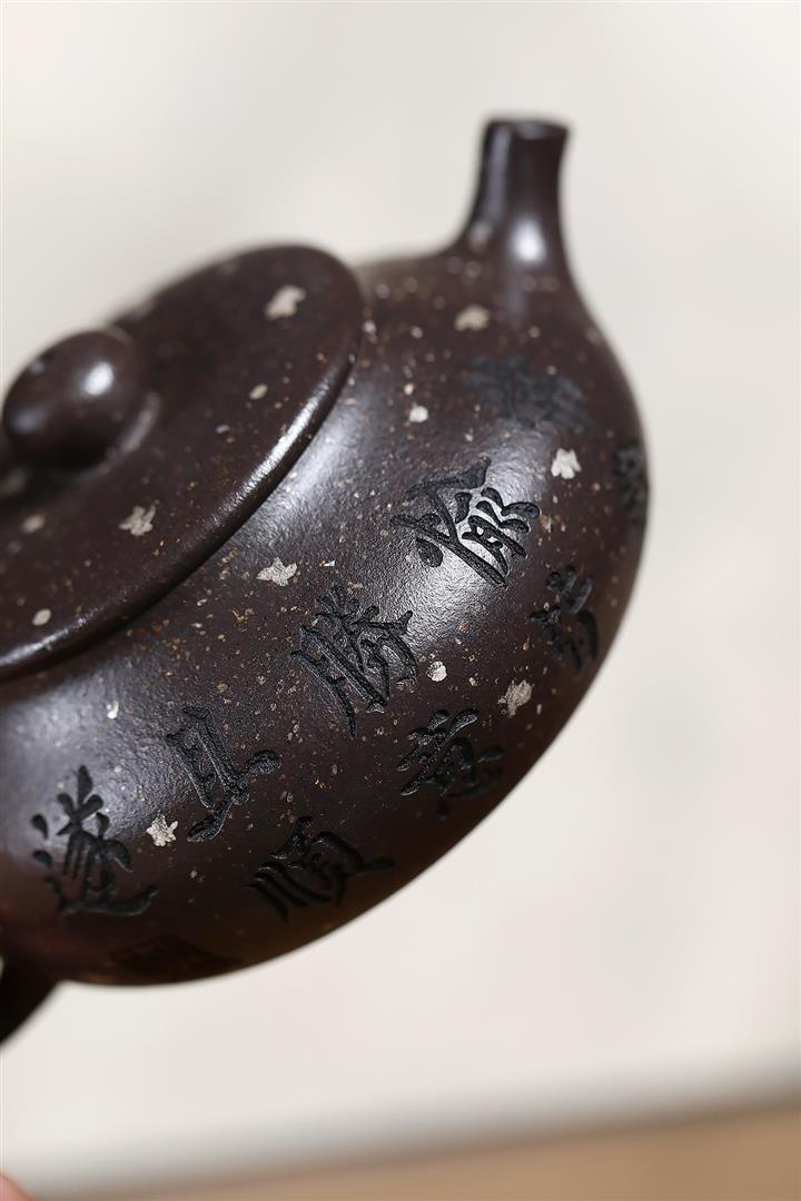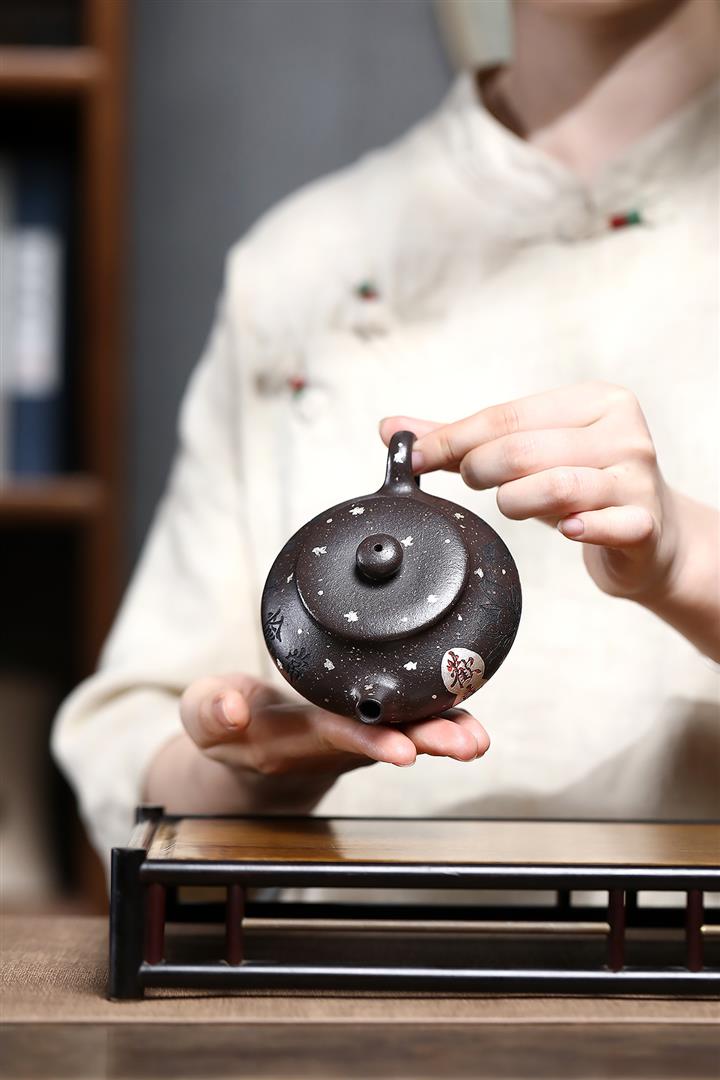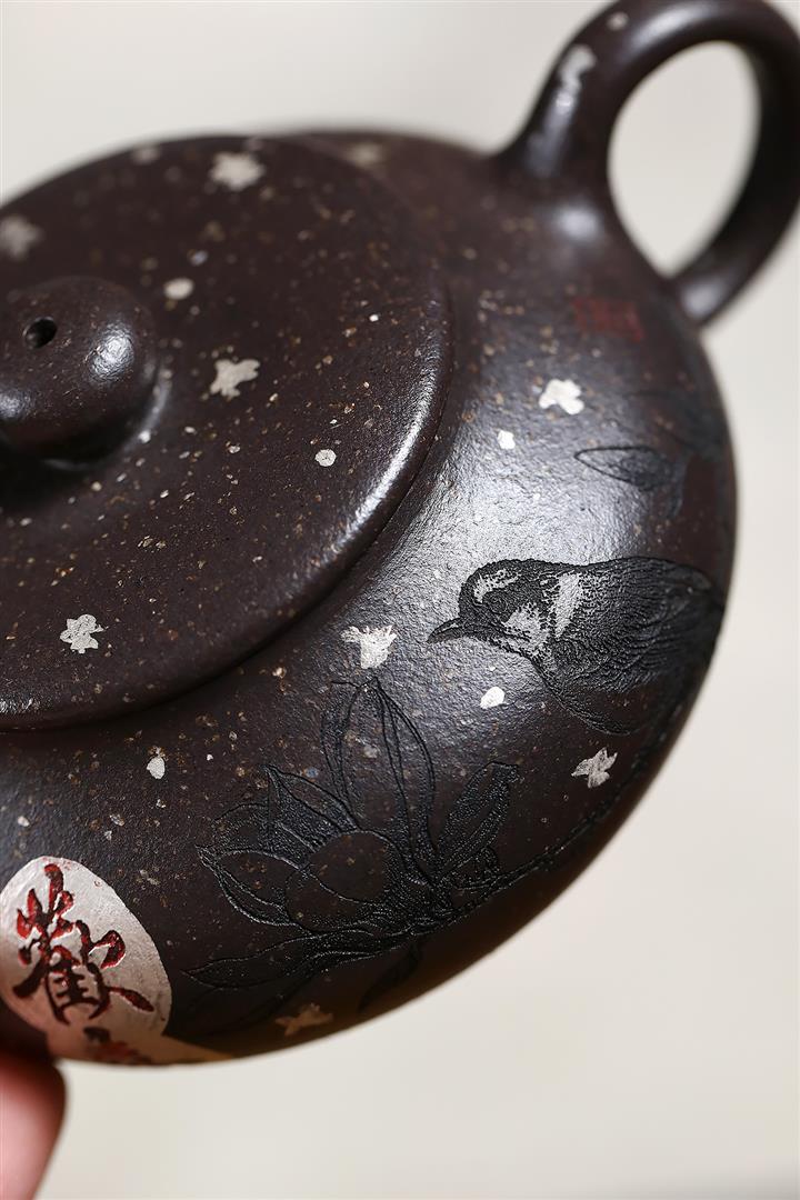 150cc原礦描銀鋪砂雪花紫泥扁柿茶壺POT9042