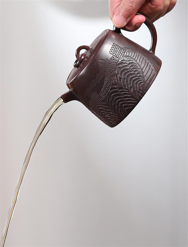 【泥料特點】砂土氣重,似淳實農民,日久使用,漸露鋒芒,養成變化,溫潤莊重。紫砂是壹種雙重氣孔結構的多孔性材質,氣孔微細,密度高。用紫砂壺沏茶,不失原味,且香不渙散,得茶之真香真味。紫砂使用越久,壺身色澤越發光亮照人,氣韻溫雅。紫砂壺長久使用器身會因撫摸擦拭,變得越發溫潤光澤。
