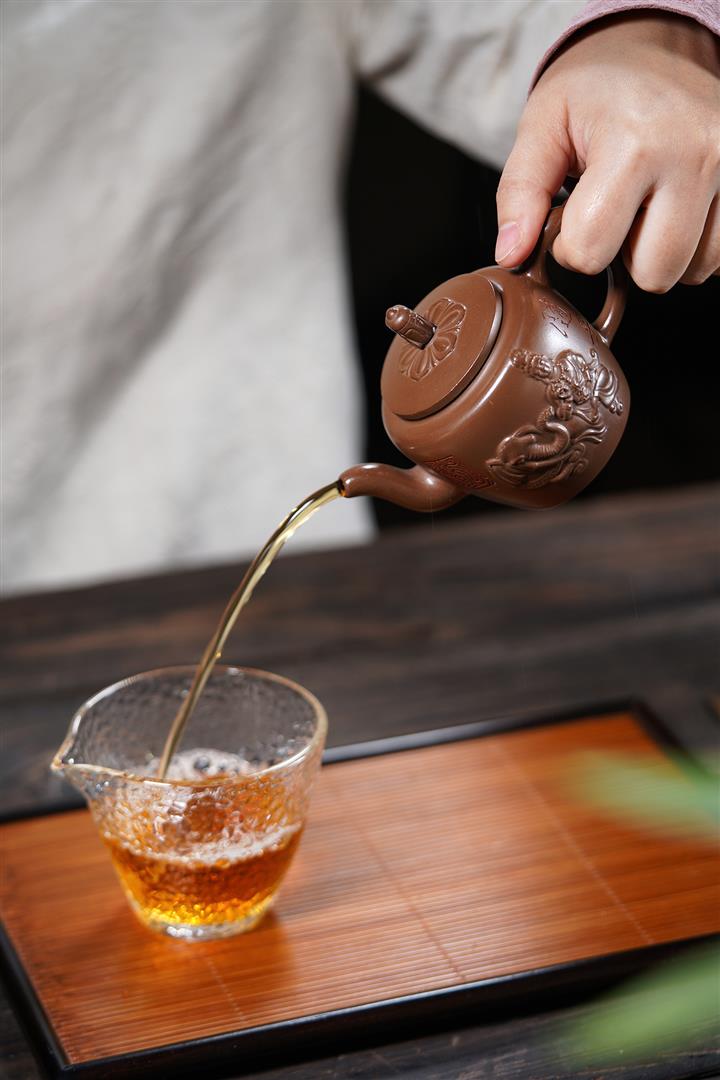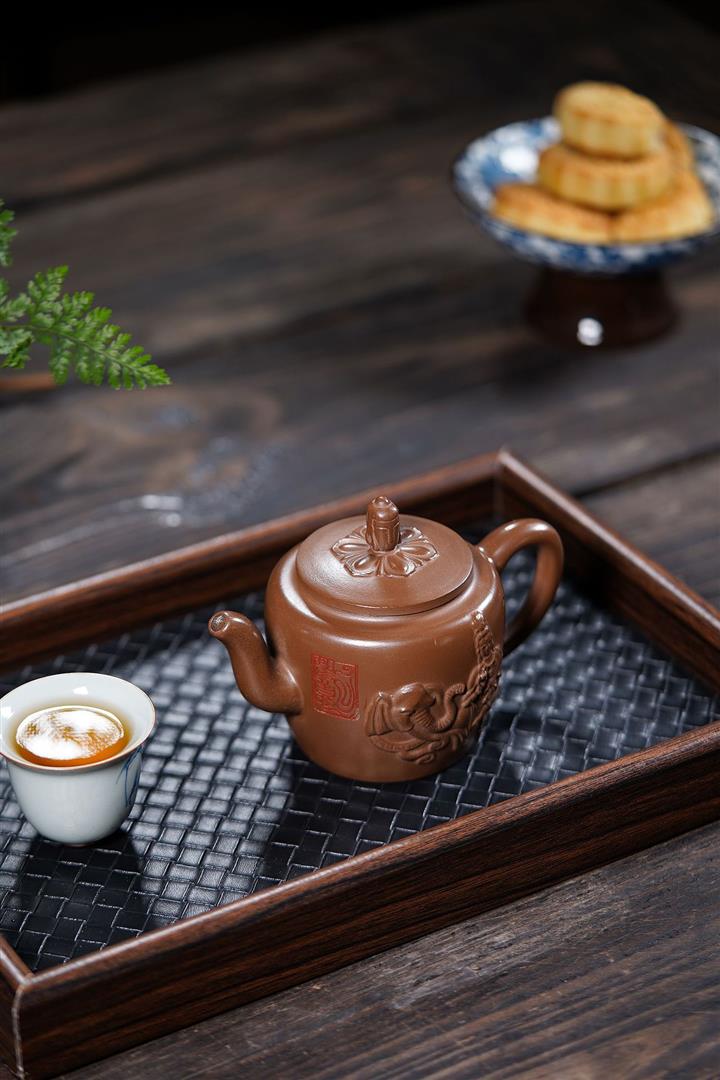 【泥料特點】砂土氣重,似淳實農民,日久使用,漸露鋒芒,養成變化,溫潤莊重。紫砂是壹種雙重氣孔結構的多孔性材質,氣孔微細,密度高。用紫砂壺沏茶,不失原味,且香不渙散,得茶之真香真味。紫砂使用越久,壺身色澤越發光亮照人,氣韻溫雅。紫砂壺長久使用器身會因撫摸擦拭,變得越發溫潤光澤。