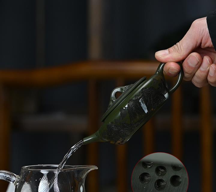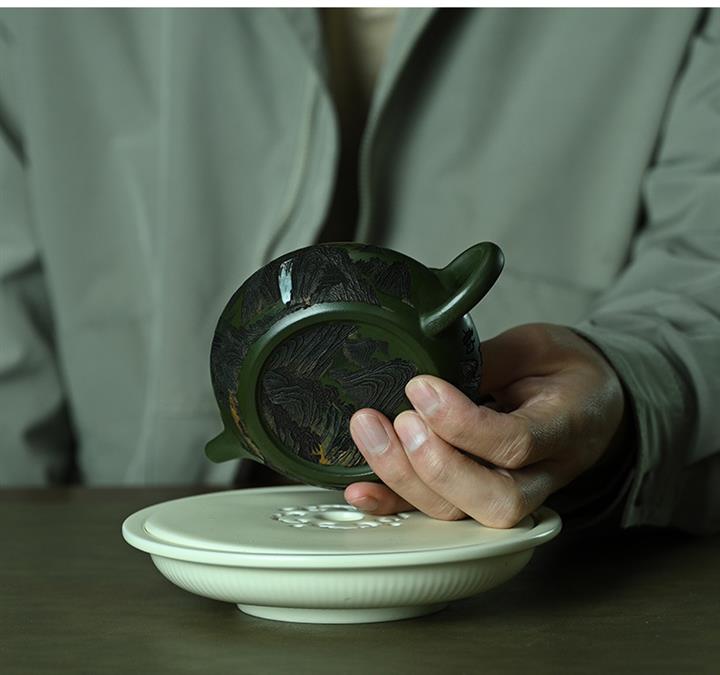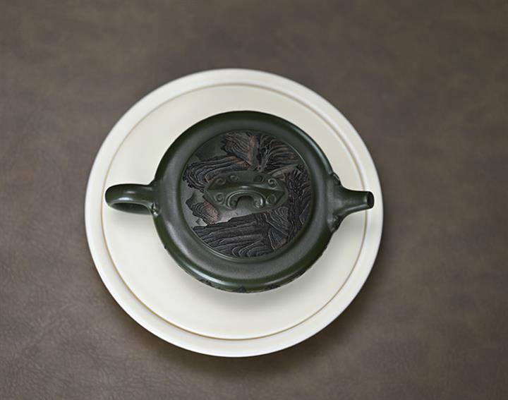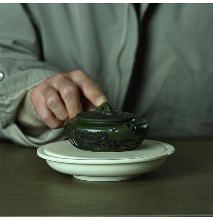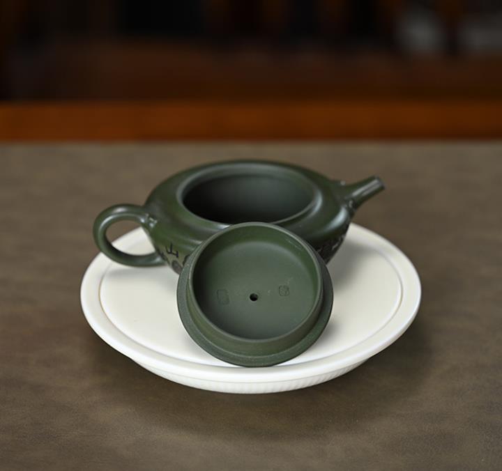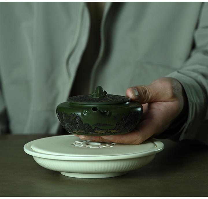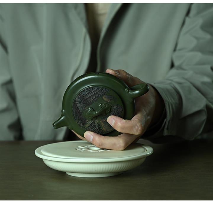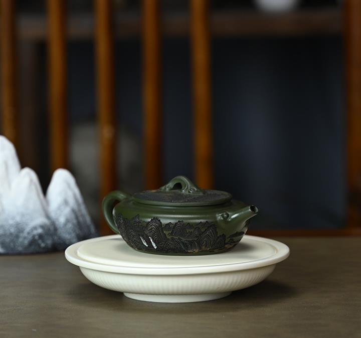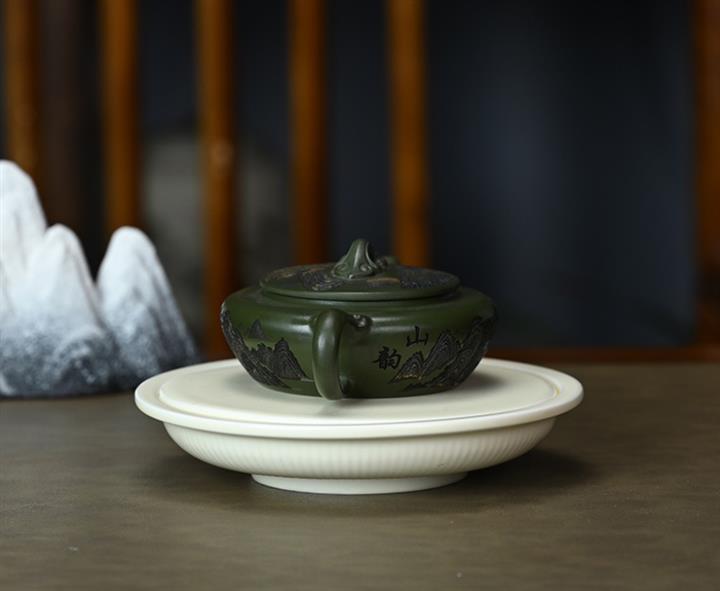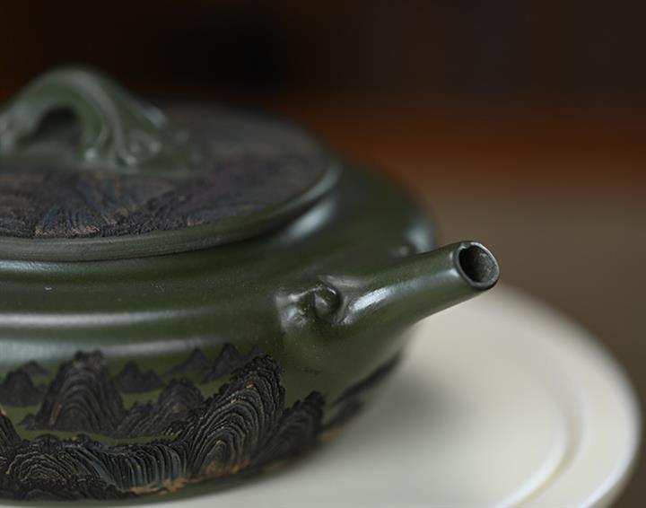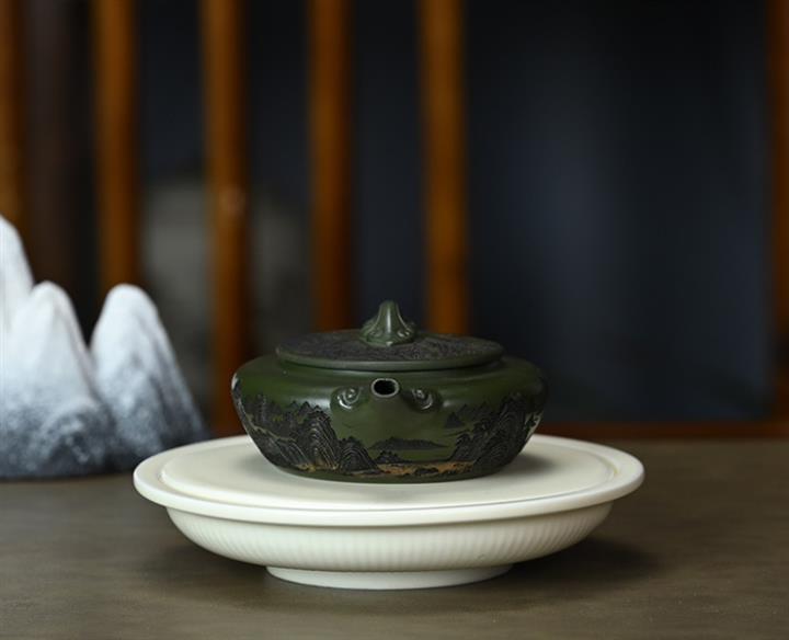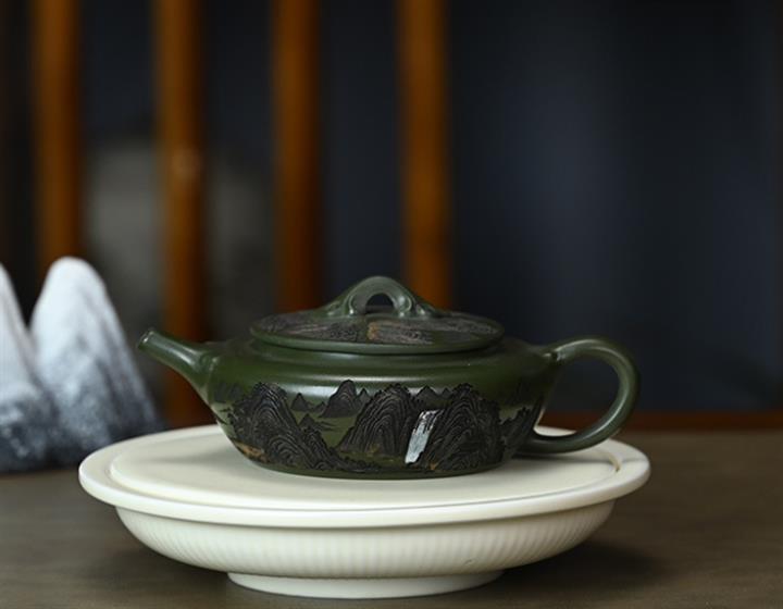190cc原礦綠泥刻繪山水扁晨泡茶壺POT9548