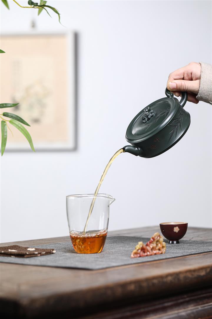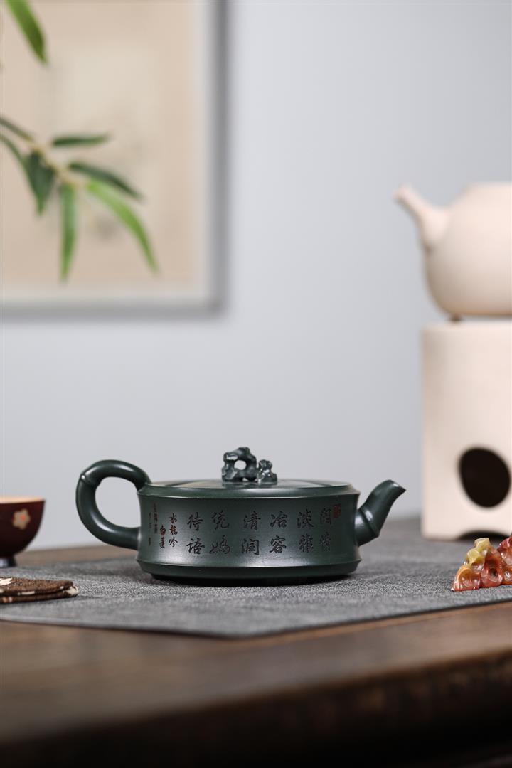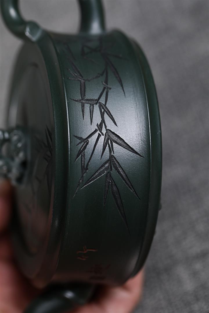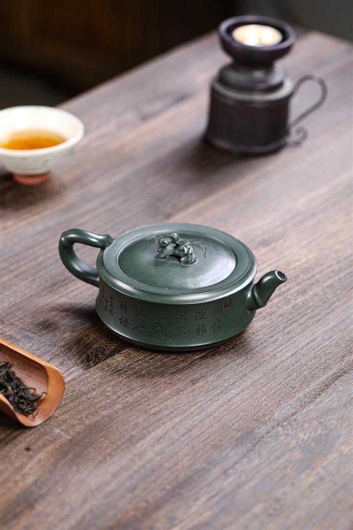 原礦墨綠泥手工滿刻提梁壺POT6720