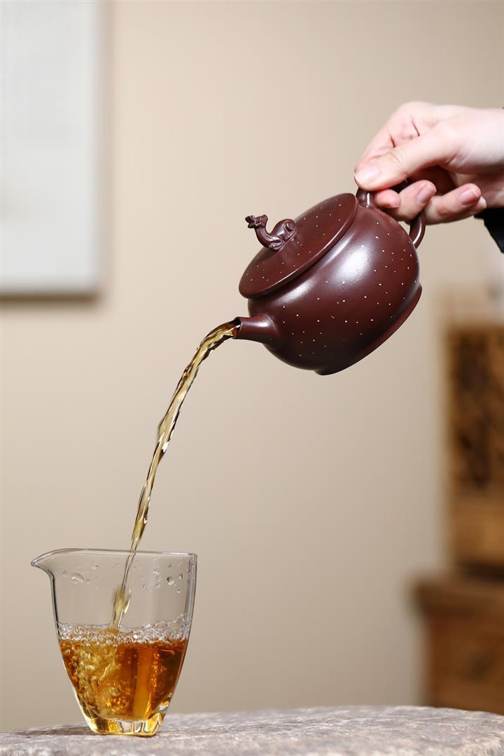 【泥料特點】砂土氣重,似淳實農民,日久使用,漸露鋒芒,養成變化,溫潤莊重。紫砂是壹種雙重氣孔結構的多孔性材質,氣孔微細,密度高。用紫砂壺沏茶,不失原味,且香不渙散,得茶之真香真味。紫砂使用越久,壺身色澤越發光亮照人,氣韻溫雅。紫砂壺長久使用器身會因撫摸擦拭,變得越發溫潤光澤。