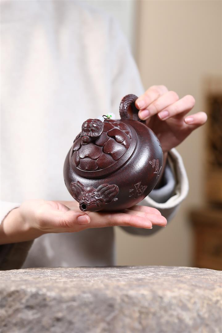 【泥料特點】砂土氣重,似淳實農民,日久使用,漸露鋒芒,養成變化,溫潤莊重。紫砂是壹種雙重氣孔結構的多孔性材質,氣孔微細,密度高。用紫砂壺沏茶,不失原味,且香不渙散,得茶之真香真味。紫砂使用越久,壺身色澤越發光亮照人,氣韻溫雅。紫砂壺長久使用器身會因撫摸擦拭,變得越發溫潤光澤。