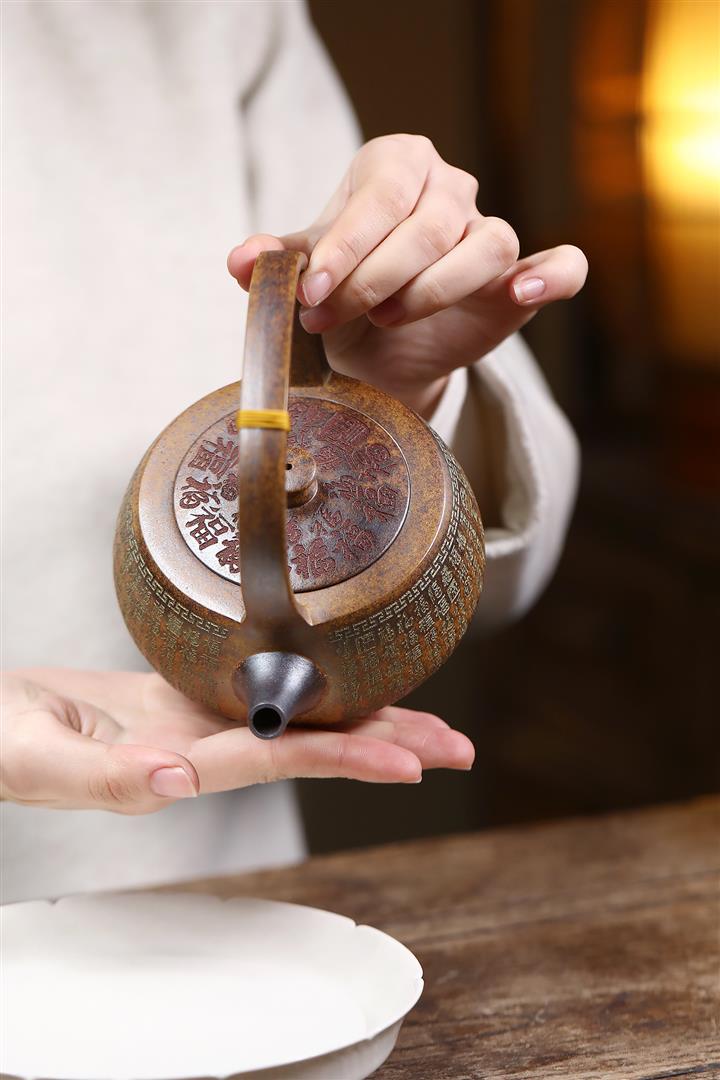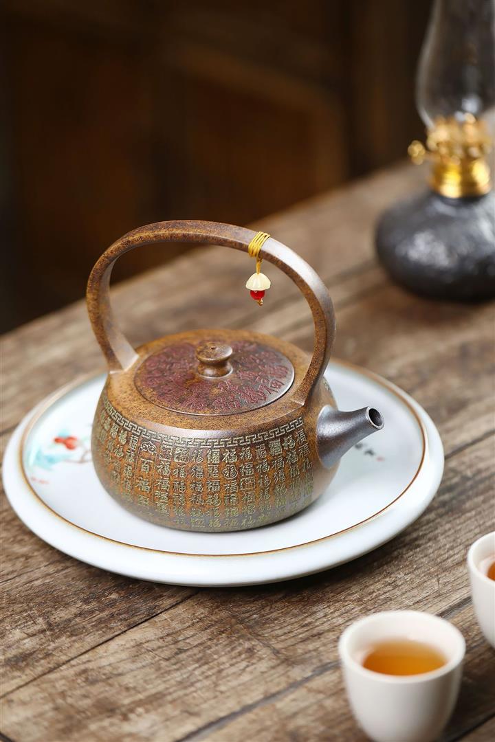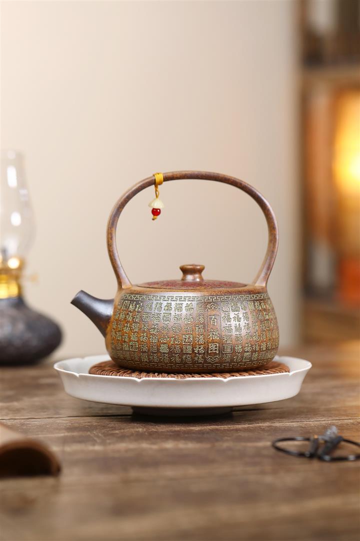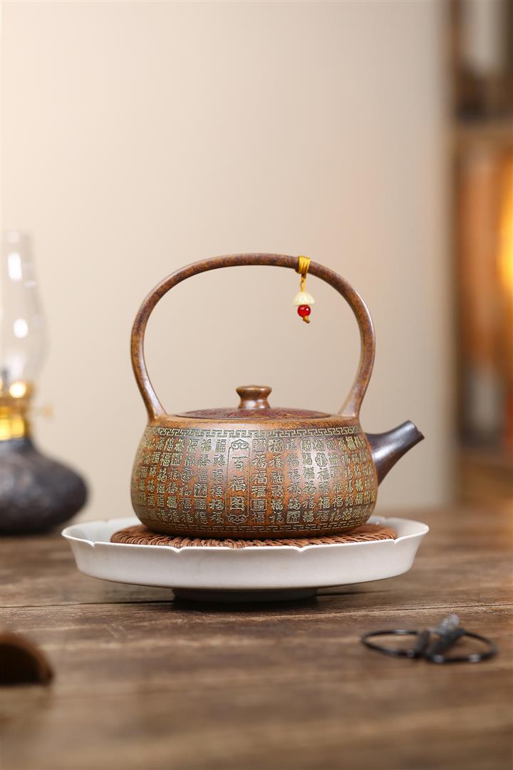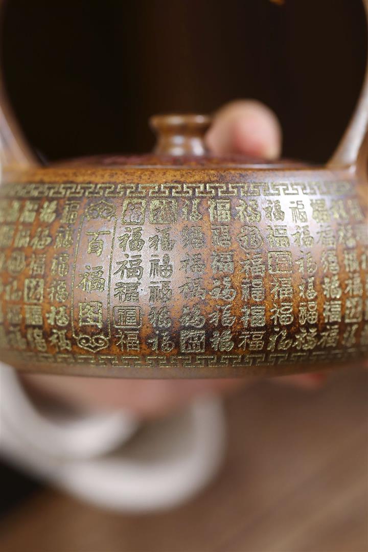 340cc龍骨金砂高溫柴燒百福提梁遇水變色泡茶壺POT9630