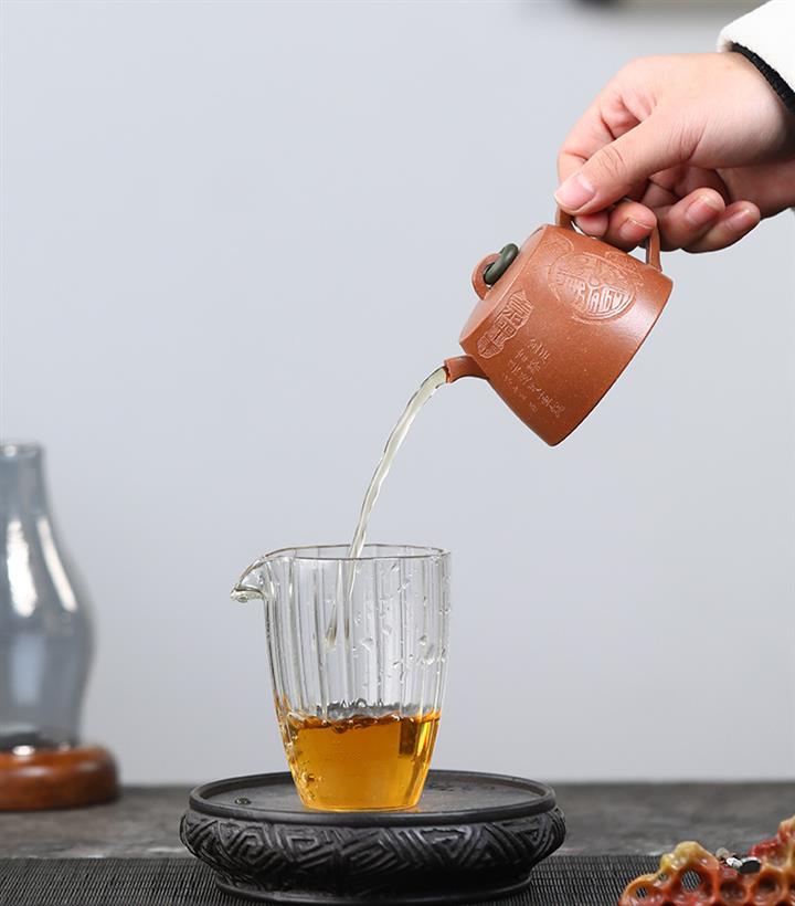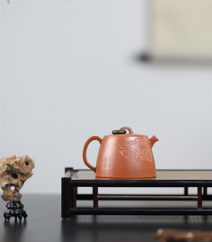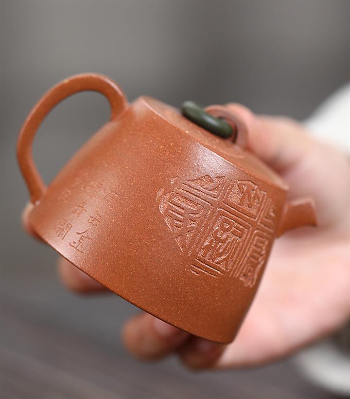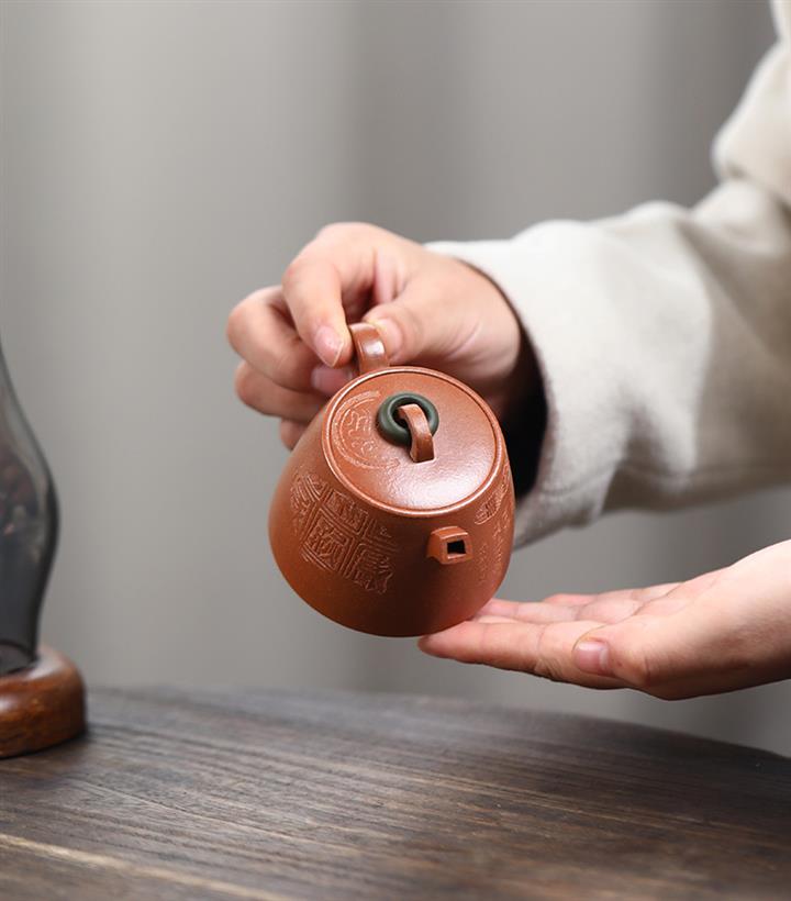 【泥料特點】砂土氣重,似淳實農民,日久使用,漸露鋒芒,養成變化,溫潤莊重。紫砂是壹種雙重氣孔結構的多孔性材質,氣孔微細,密度高。用紫砂壺沏茶,不失原味,且香不渙散,得茶之真香真味。紫砂使用越久,壺身色澤越發光亮照人,氣韻溫雅。紫砂壺長久使用器身會因撫摸擦拭,變得越發溫潤光澤。