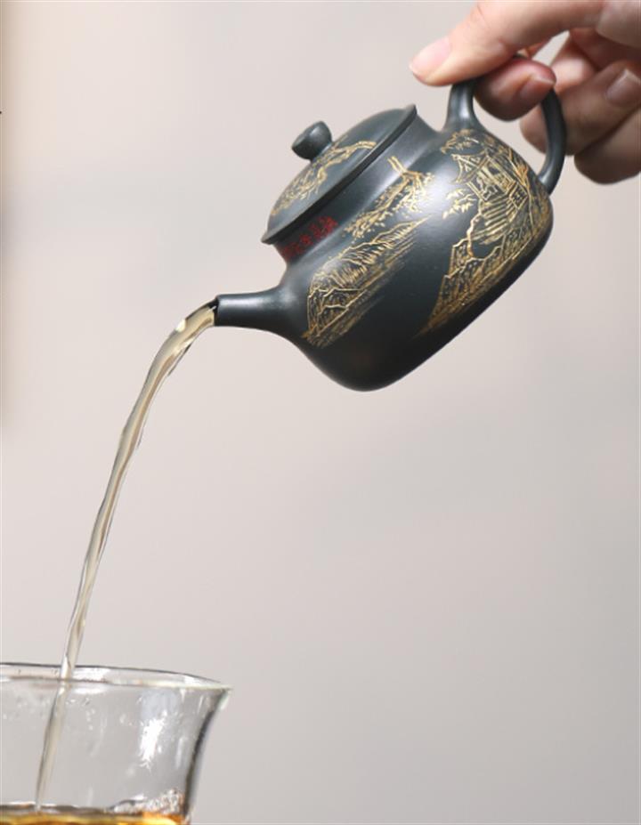 【泥料特點】砂土氣重,似淳實農民,日久使用,漸露鋒芒,養成變化,溫潤莊重。紫砂是壹種雙重氣孔結構的多孔性材質,氣孔微細,密度高。用紫砂壺沏茶,不失原味,且香不渙散,得茶之真香真味。紫砂使用越久,壺身色澤越發光亮照人,氣韻溫雅。紫砂壺長久使用器身會因撫摸擦拭,變得越發溫潤光澤。