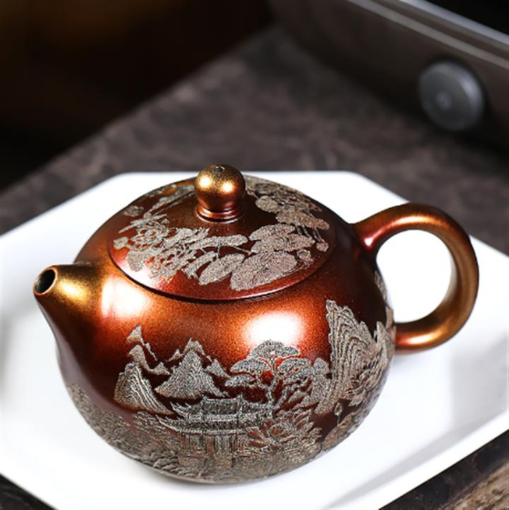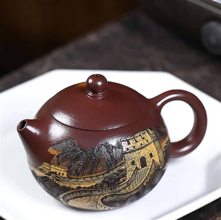 320cc原礦古烏泥萬裏長城彩刻伏虎茶壺POT8723